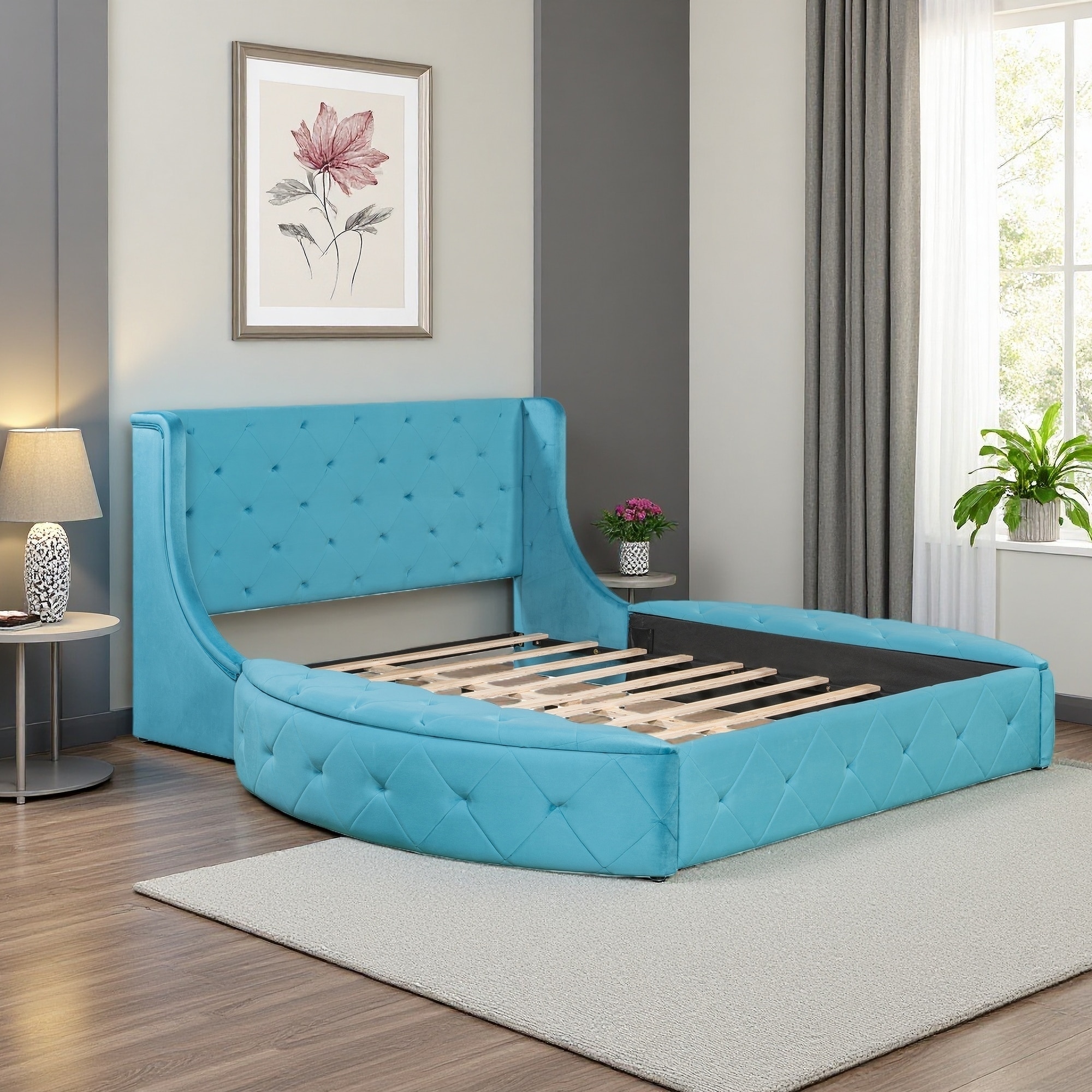 Queen Size Upholstered Velvet Platform Bed with Wingback Headboard, 1 Large Storage Drawer, and 2 Side Storage Stools