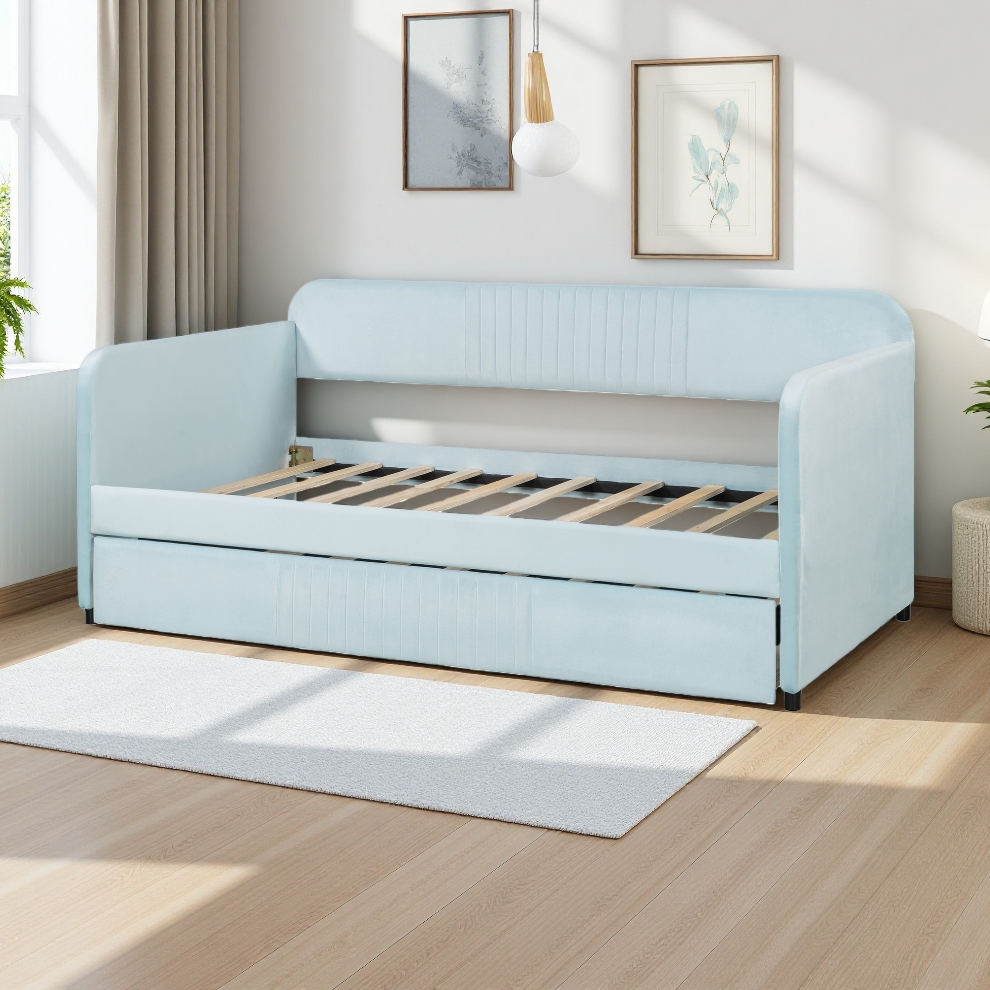 Twin Size Upholstered Velvet Daybed Sofa with Pull-Out Trundle, Wooden Slats, Space-Saving Design with Backrest and Armrests