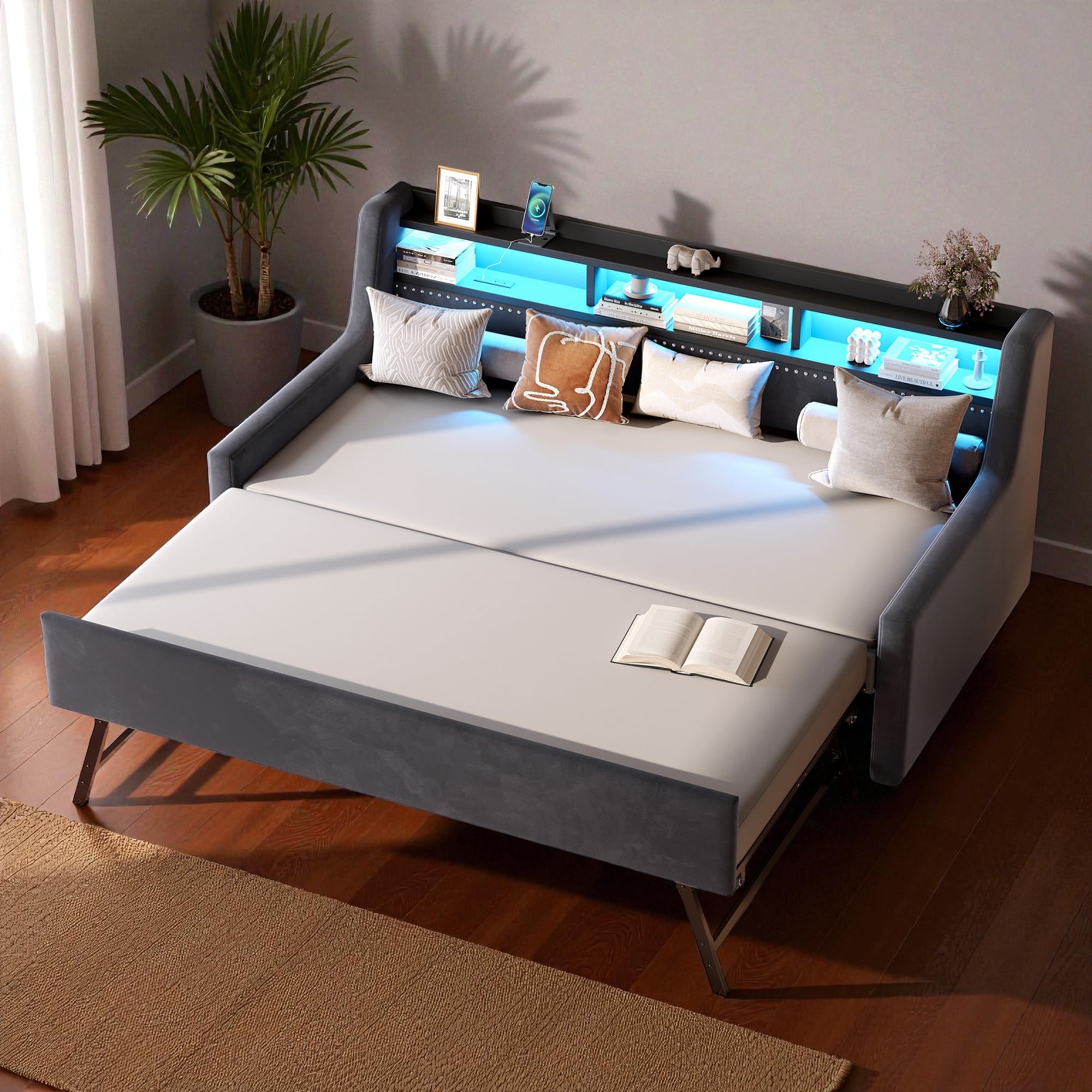 Twin Size Daybed with Trundle, Upholstered Daybed with LED Light and Charging Station, Wood and Metal Frame Sofa Bed