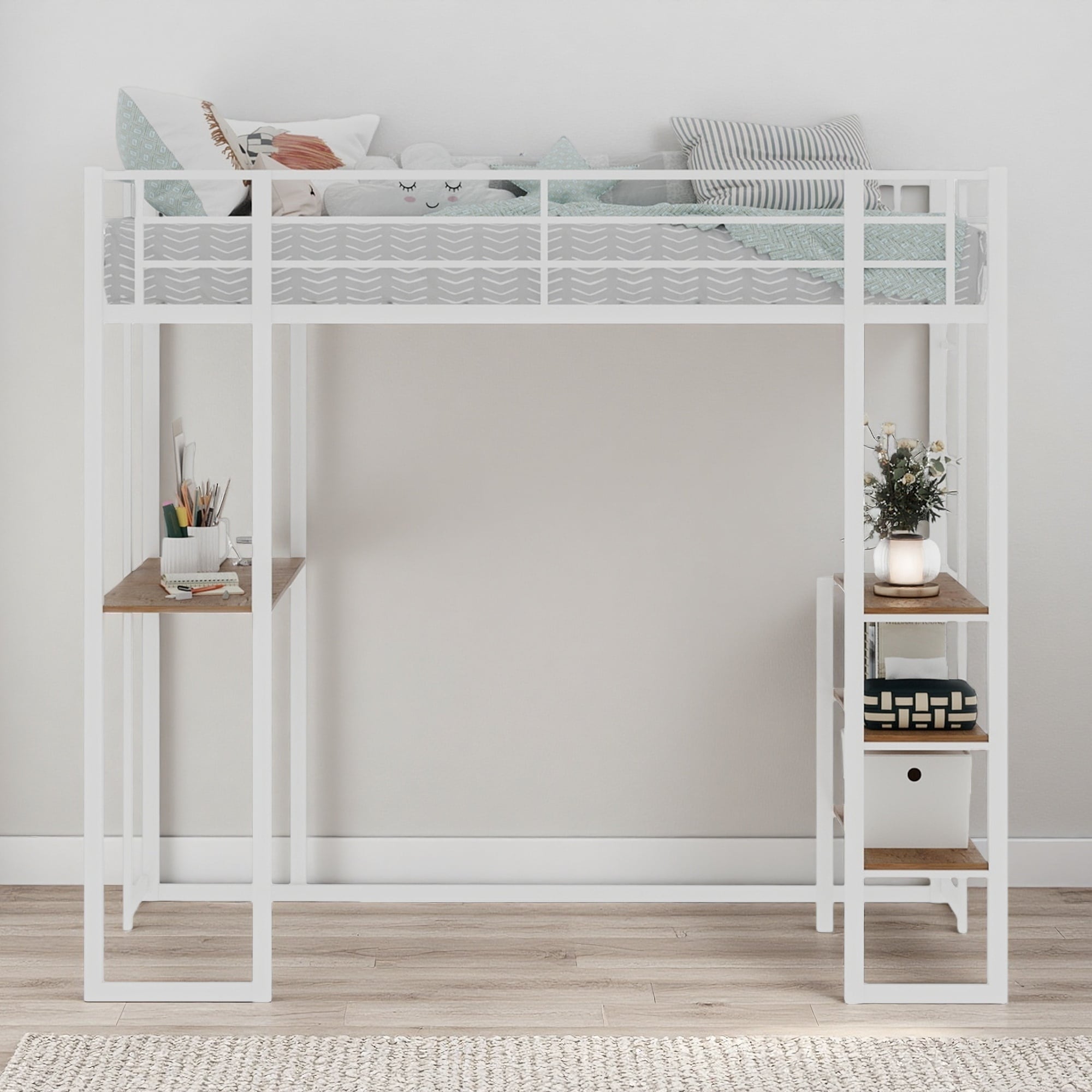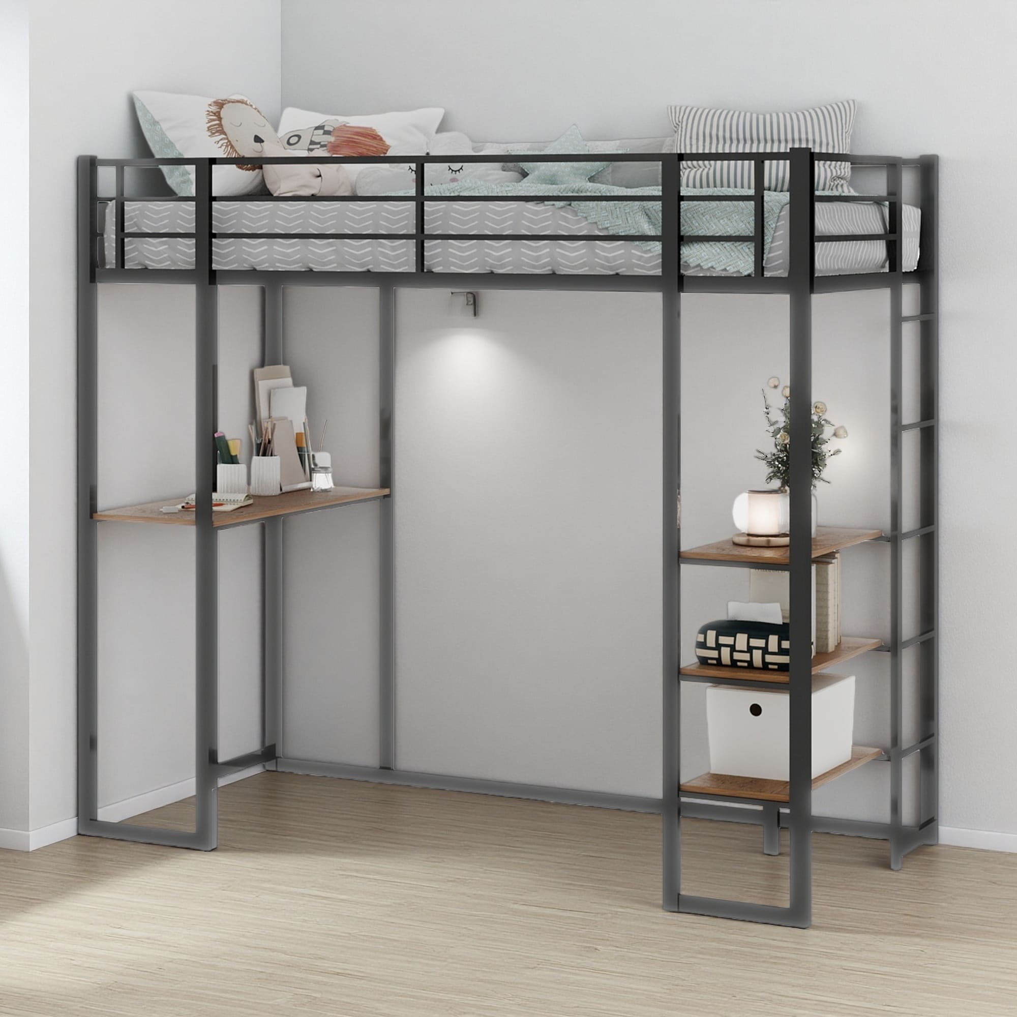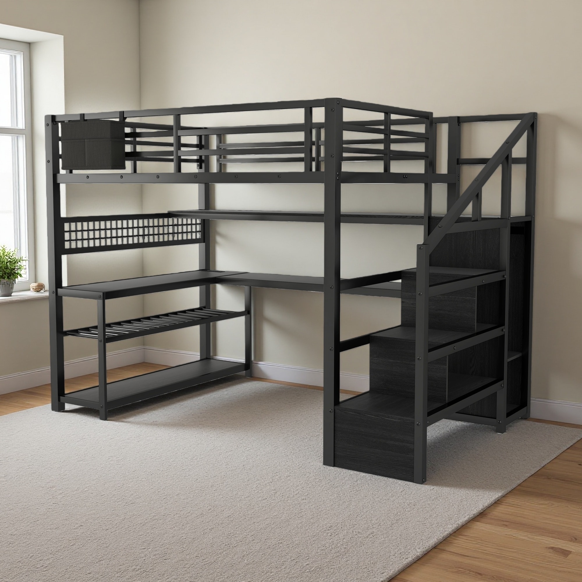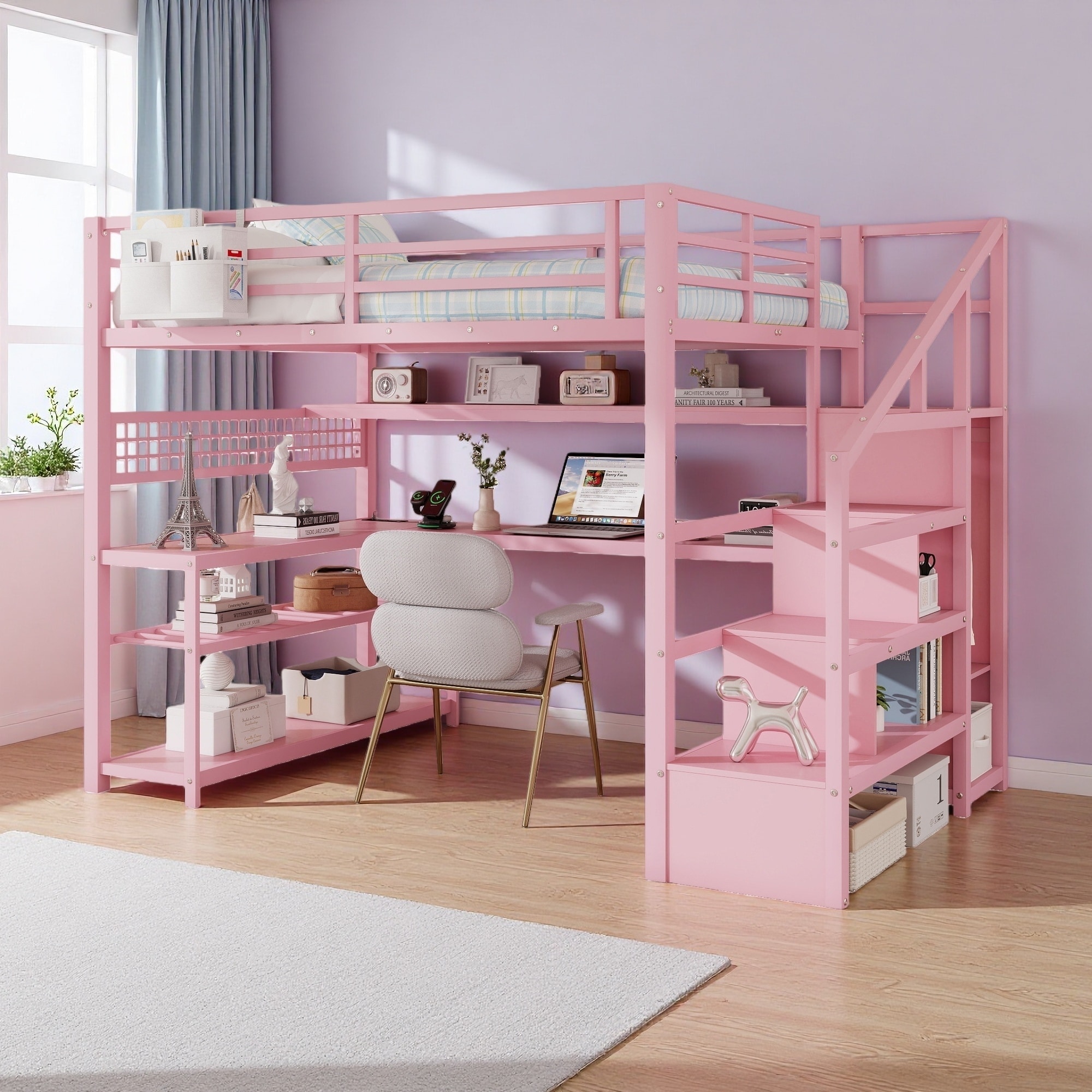 Twin Size Iron Frame Bed with L-Shaped Desk, Children's & Youth Home Bed with Stairs and Railings, with Stairs on Both Sides