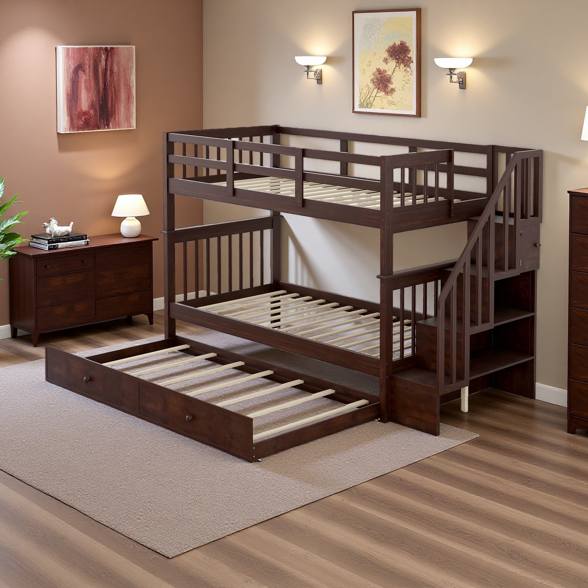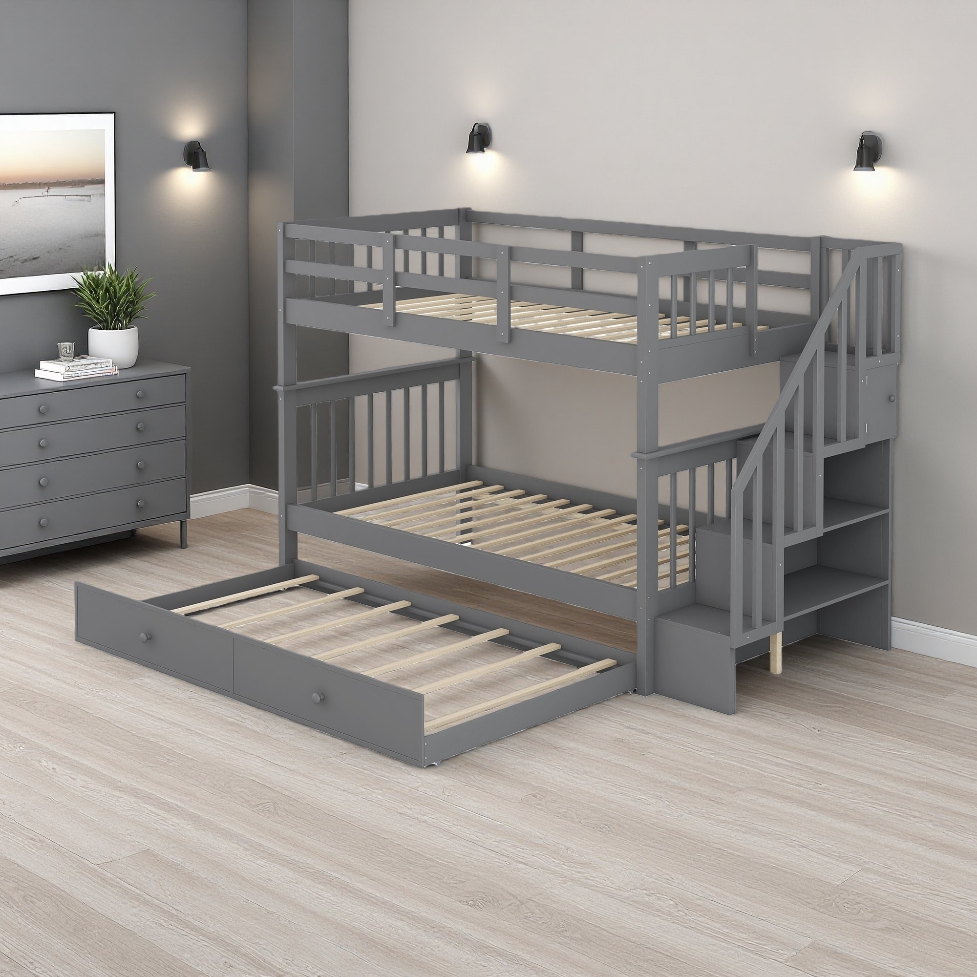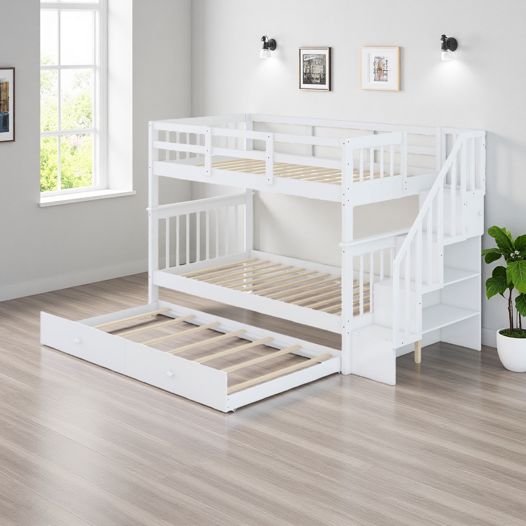 Twin-Over-Twin Solid Wood Bunk Bed with Storage Staircase and Twin Trundle