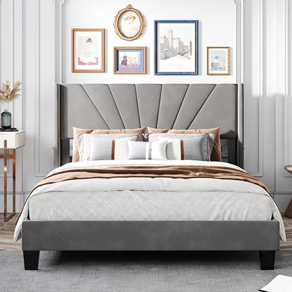 Modern Low Profile Upholstered Platform Bed w/ Adjustable Headboard, Beige