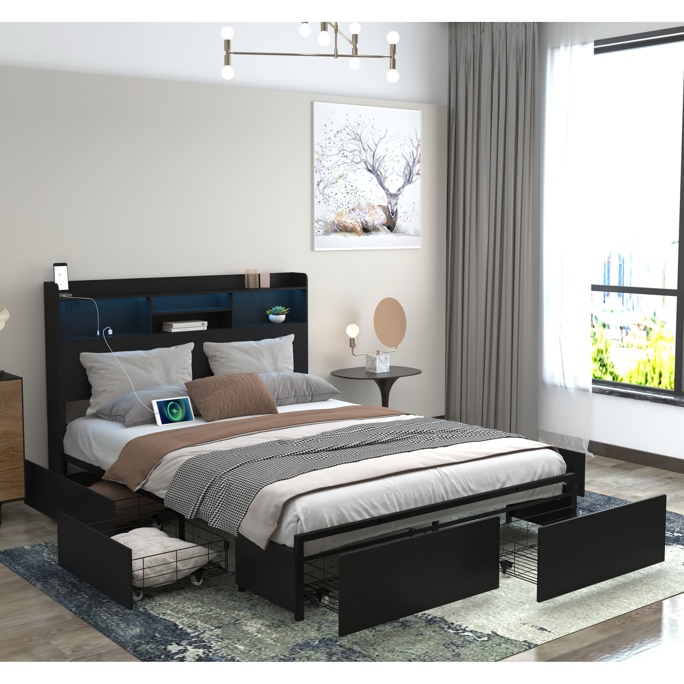 Queen Size Bed Frame with 4 Storage Drawers, Headboard & Storage Shelf, LED & Charging Station, No Noise, No Box Springs Needed