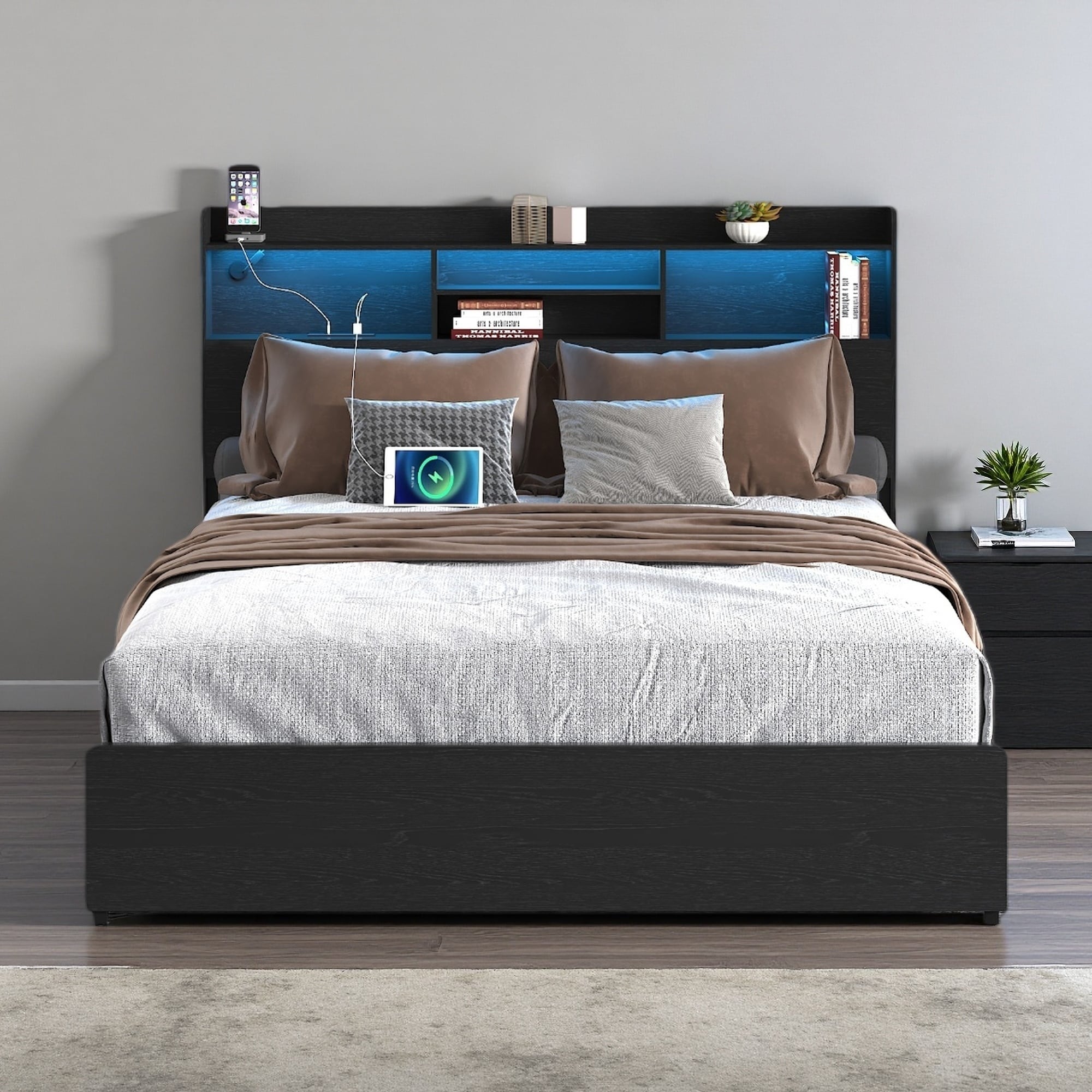 Full Bed Frame With Storage Drawers Headboard Storage Shelf LED Charging Station No Noise No Box Spring