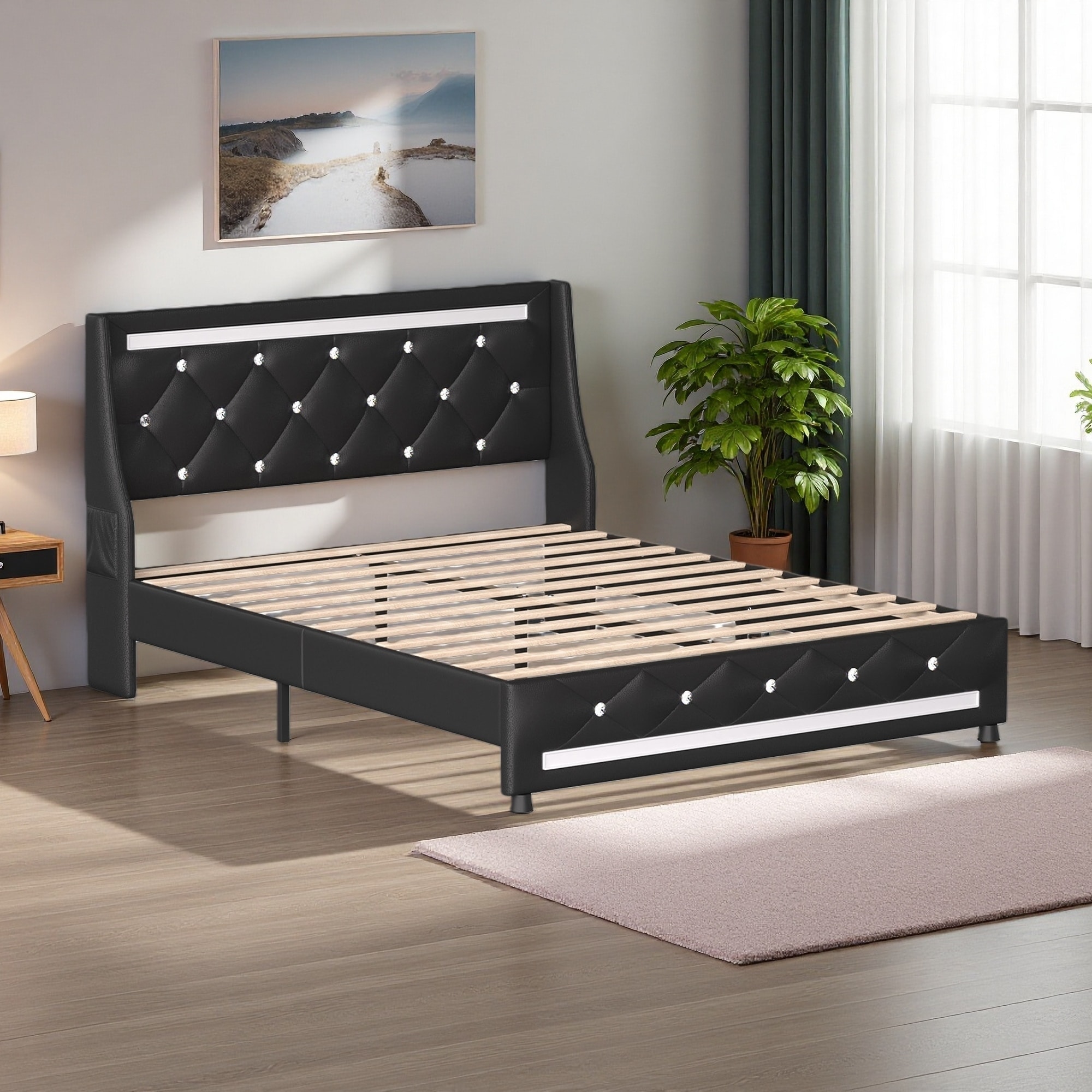 Full Size Platform Bed with Headboard Upholstered with Charging Station, LED Lights, Mattress Foundation with Wooden Slats