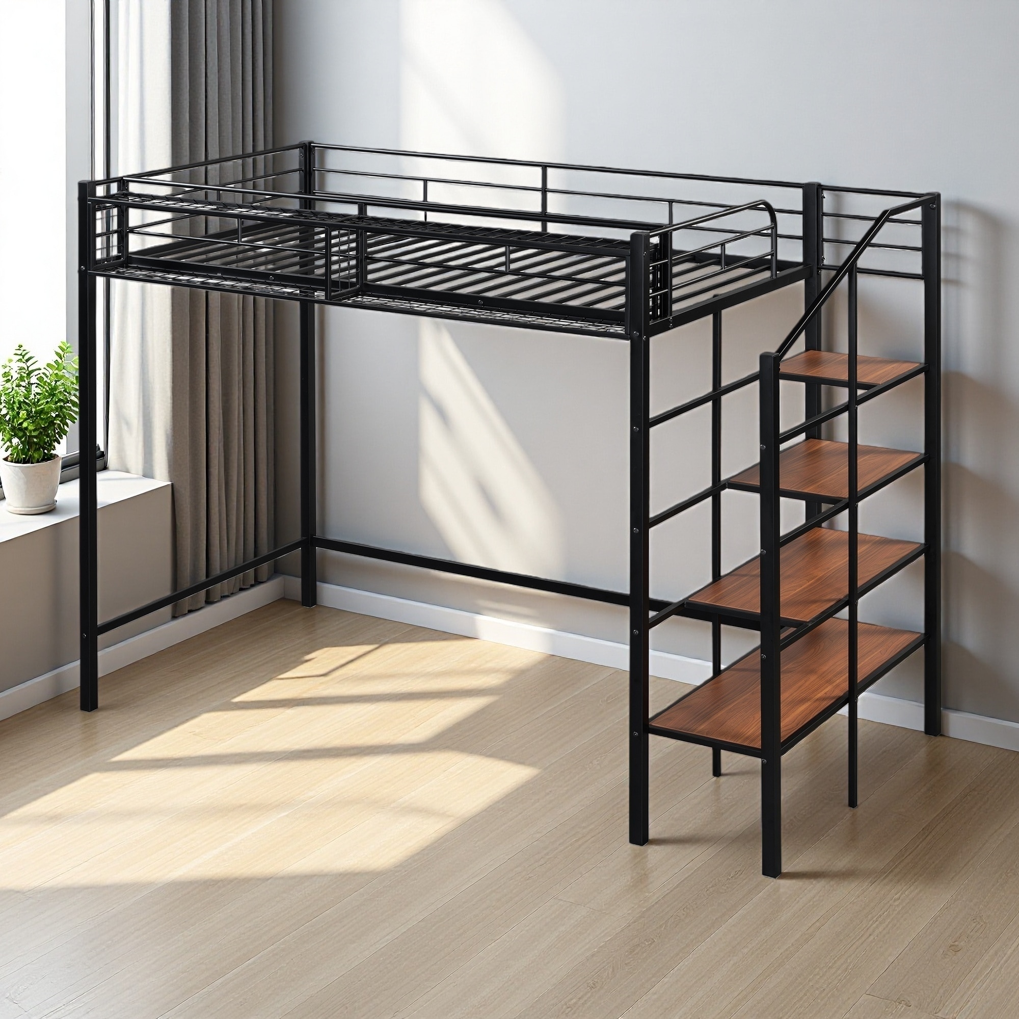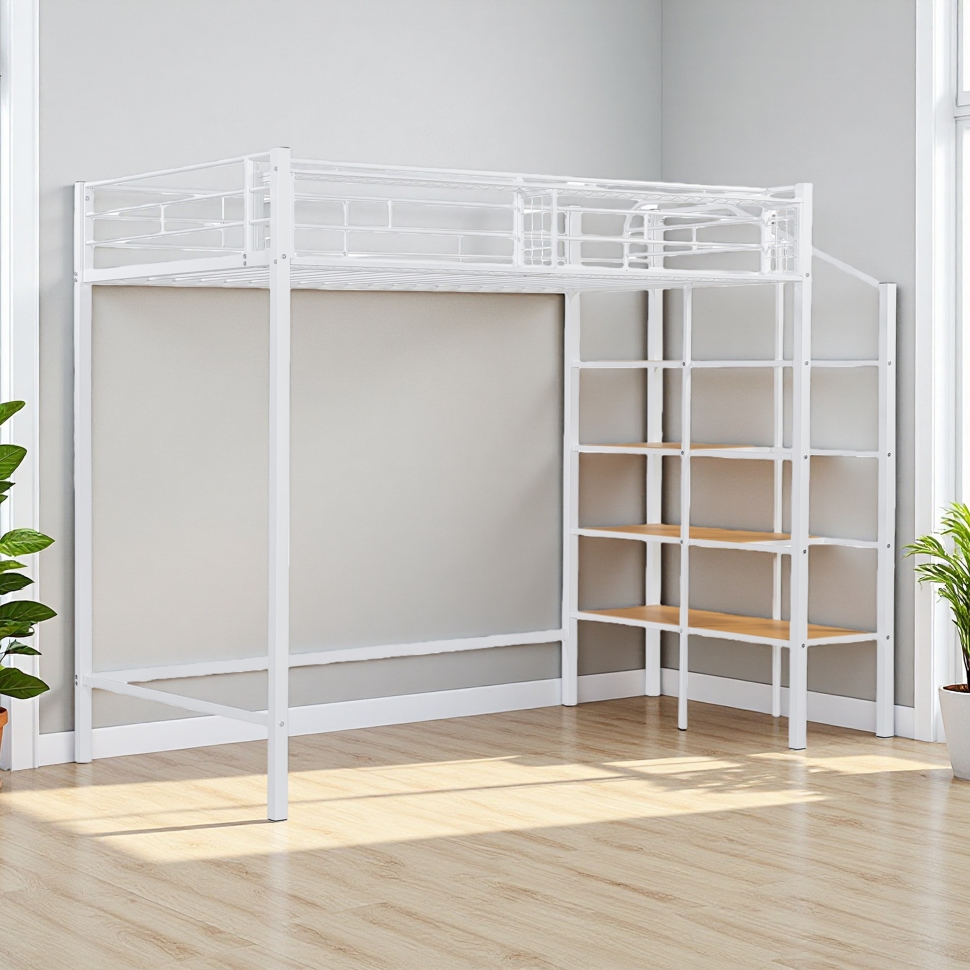 Twin Size Metal Loft Bed with Upper Grid Storage Shelf and Lateral Storage Ladder