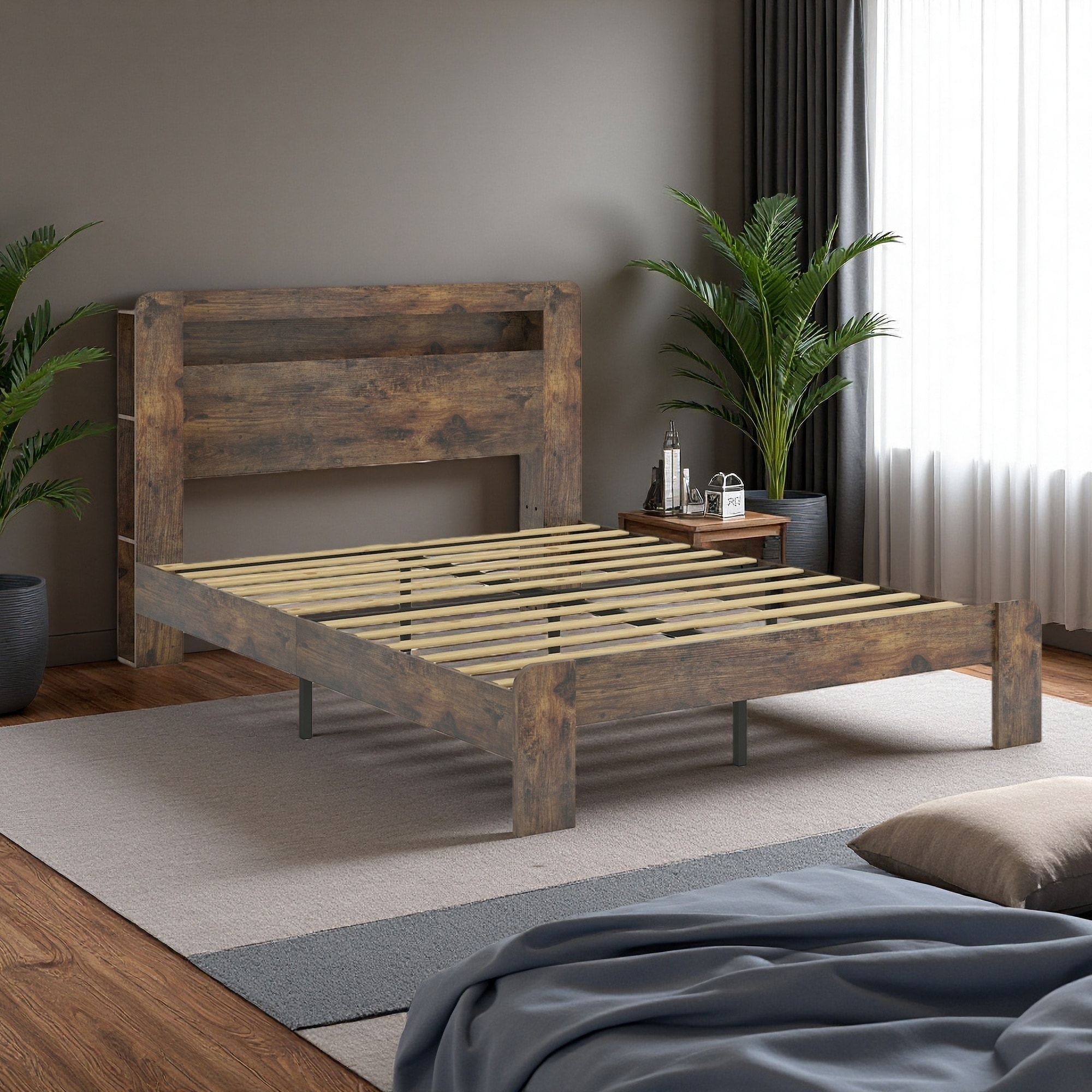 Brown Faux Leather Full Bed Frame with Wood Panel Headboard and Upholstered Design