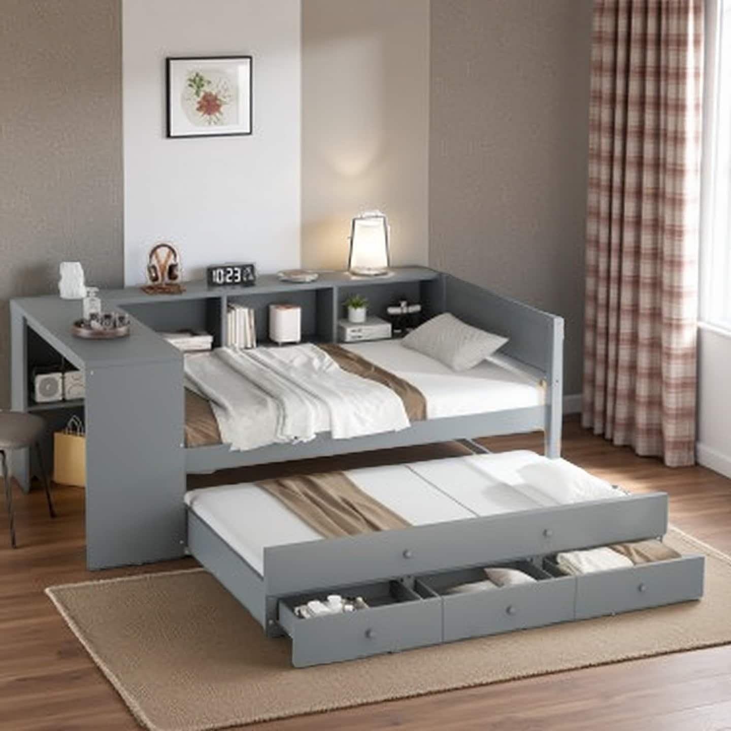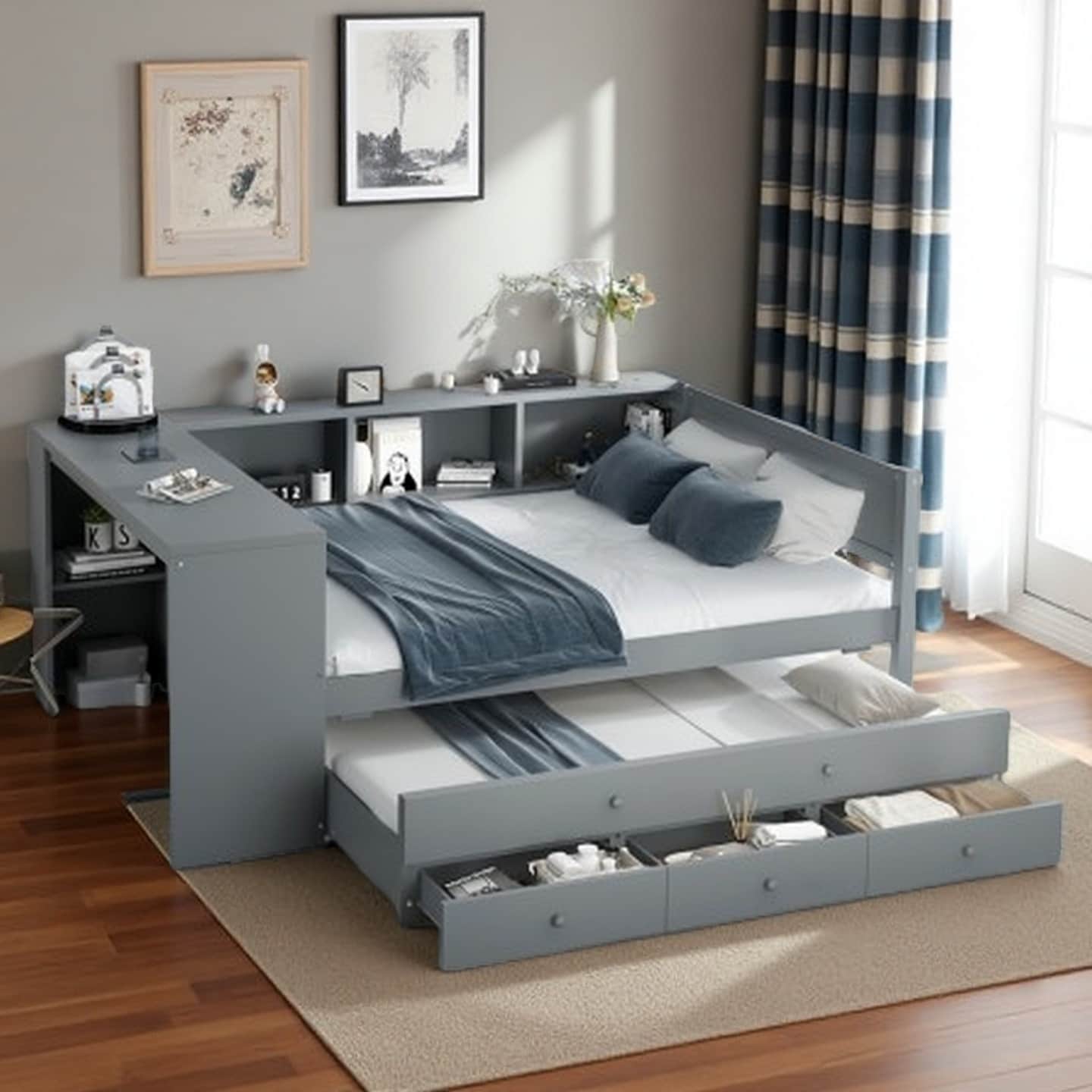 Three Storage Drawers and Shelf,Twin over Full Bunk Bed with Trundle and Built-in Desk, Very suitable for bedrooms Grey