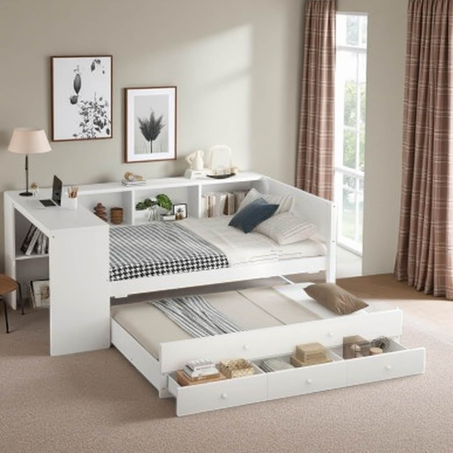 Full Size White Wood Daybed with Trundle, Built-In Shelves, Drawers and Desk, Multi-Functional Space-Saving Design