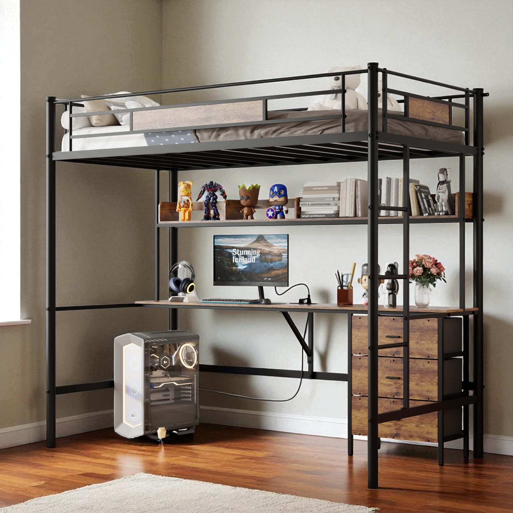Twin Size Loft Bed with L-Shaped Desk, Metal Frame with Charging Station, Fabric Drawers & Shelves, Safety Guardrail