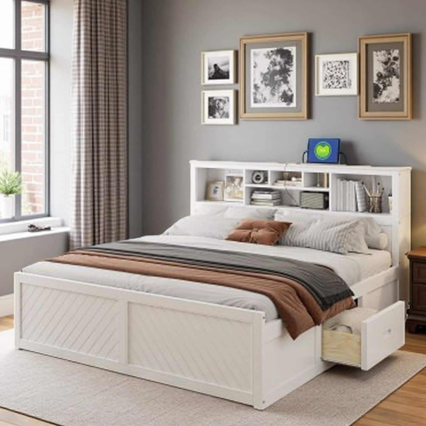 King Size Wood Platform Bed with Multi-Compartment Storage Headboard, USB Charging Ports, and Side Drawers