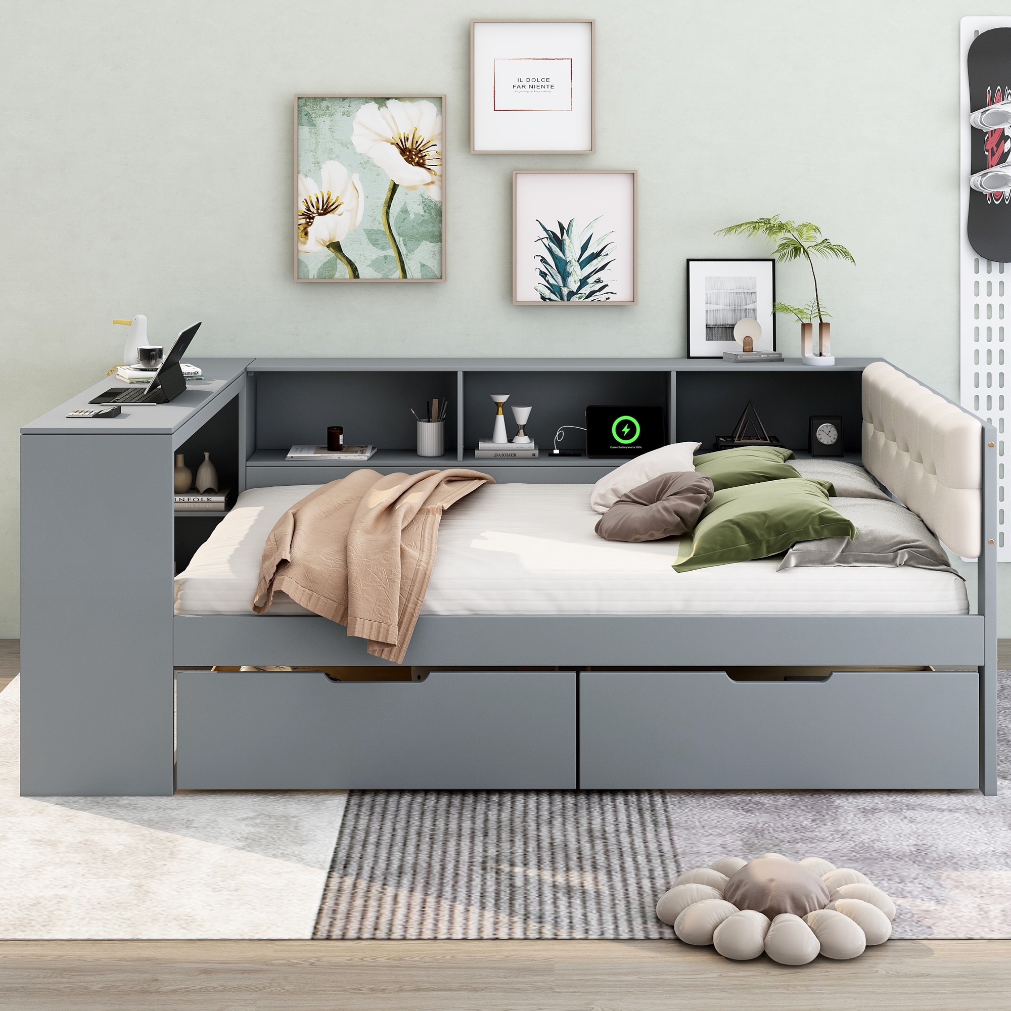 ZENIA Wood Platform Bed with Linen Headboard and Charging Station