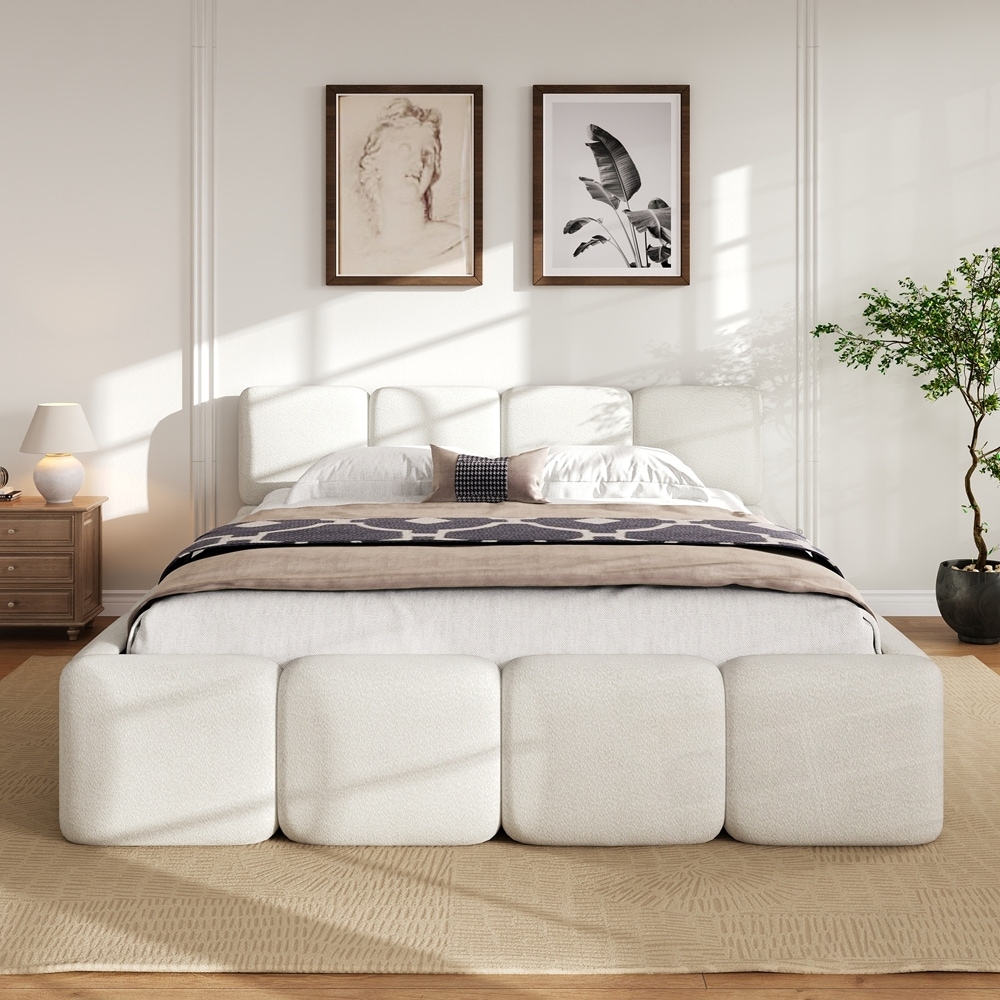 Boucle Upholstered Grounded Beds Block Style Platform Bed