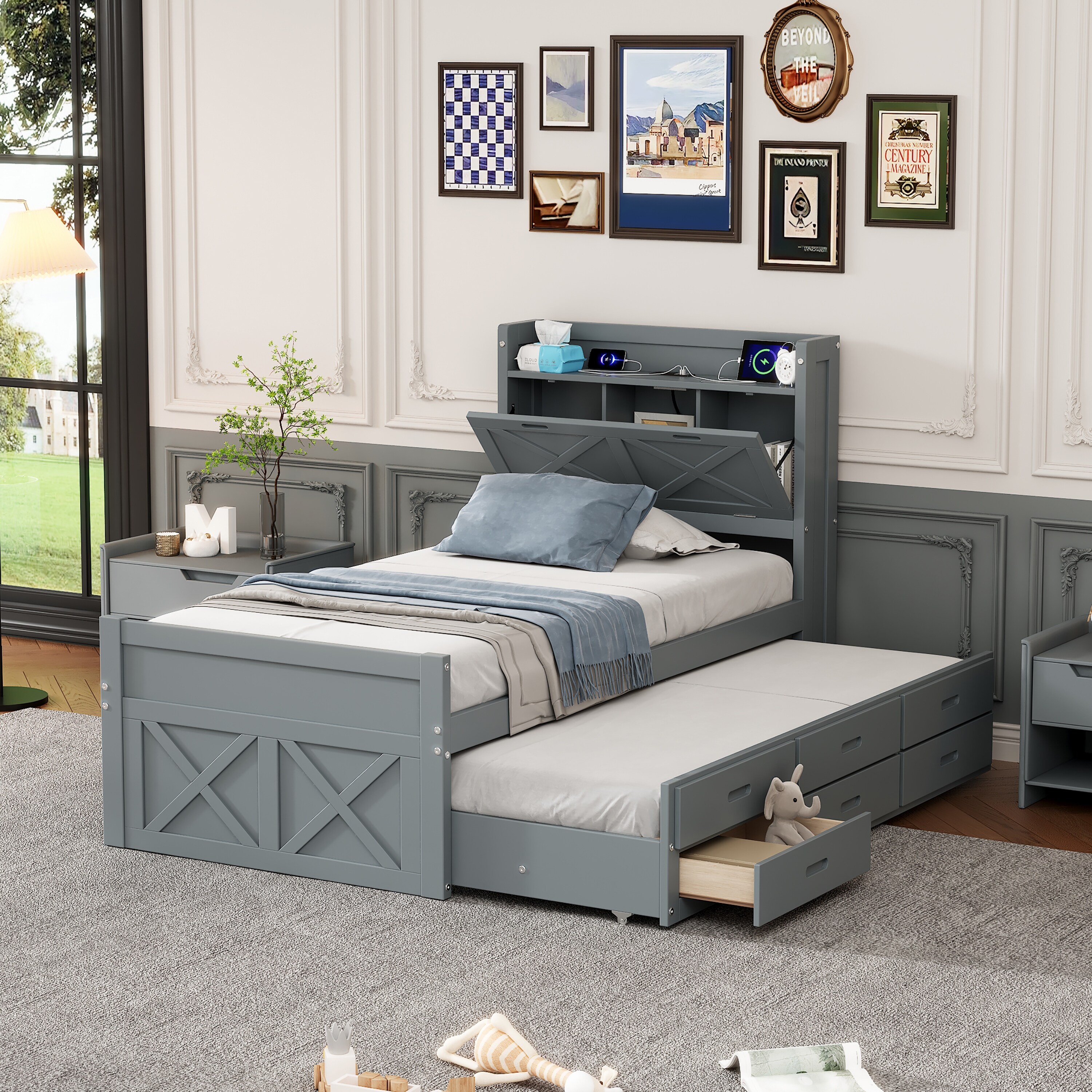 Roomfitters Full Size Wooden Bed with Storage Headboard, Built-In Outlets, Extendable Design