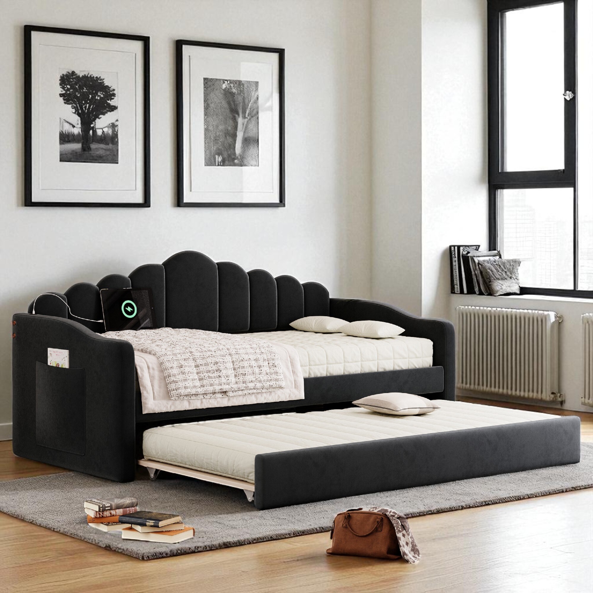 Twin Size Upholstered Daybed with Trundle and USB Ports, Velvet Sofa Bed with Storage Pockets, No Box Spring