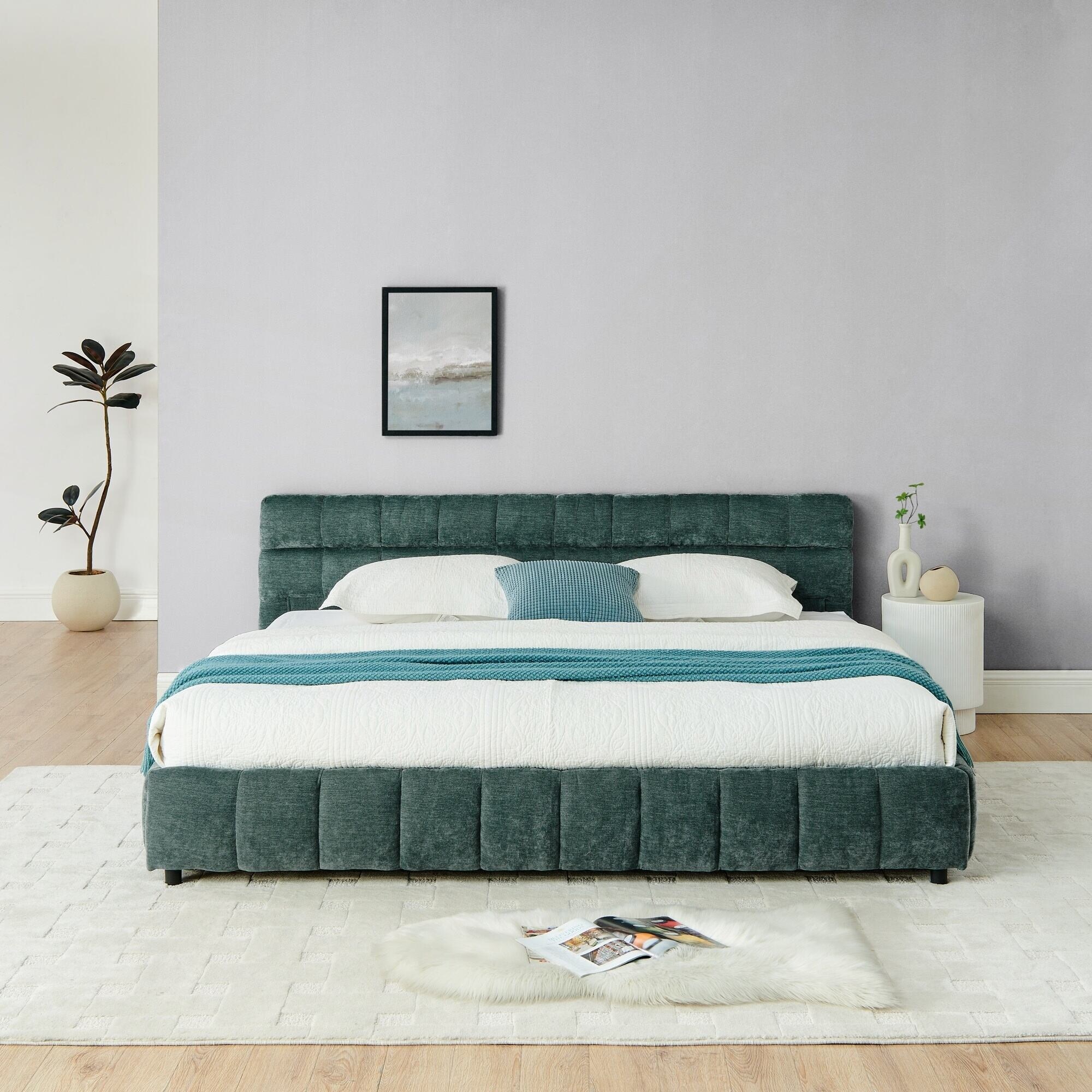 King Size Chenille Upholstered Bed with Storage Drawers, Comfortable Headboard and Solid Frame
