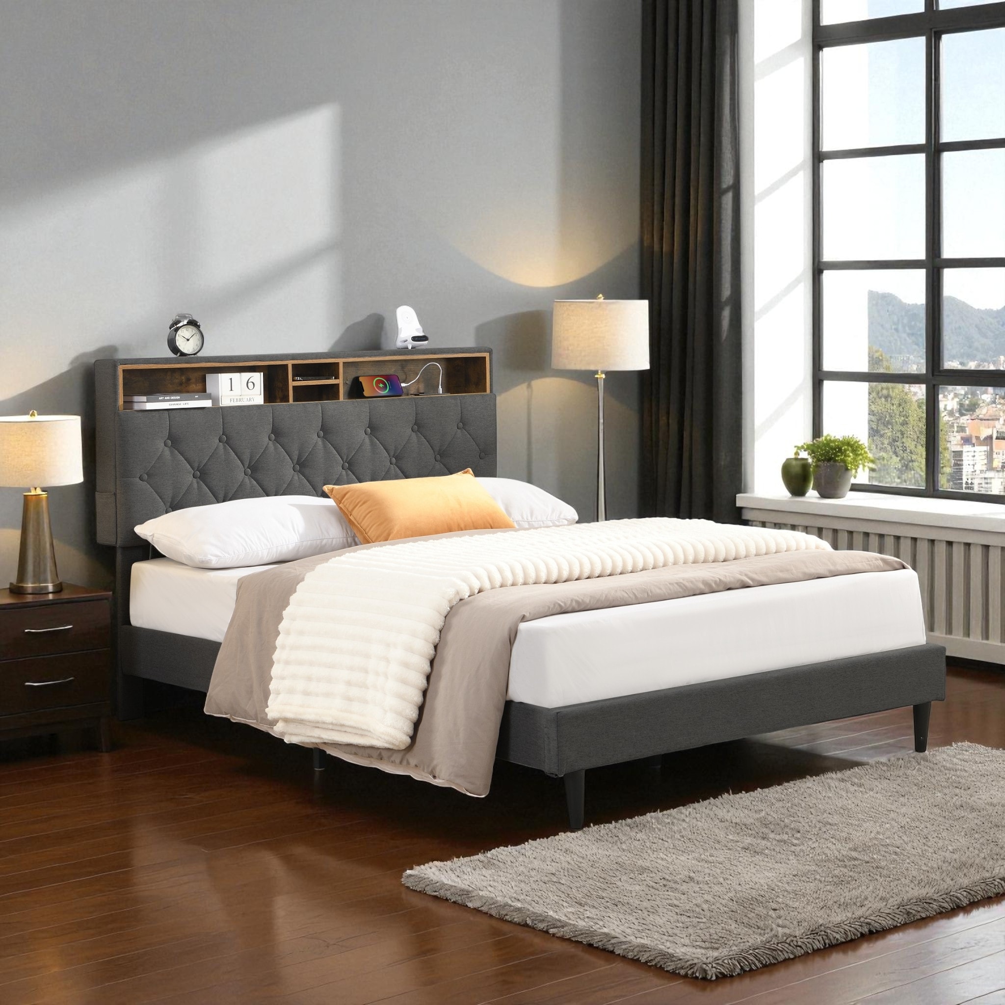 King Size Upholstered Platform Bed Frame with Linen Headboard, USB Charging Station, Storage Compartments, No Box Spring Needed