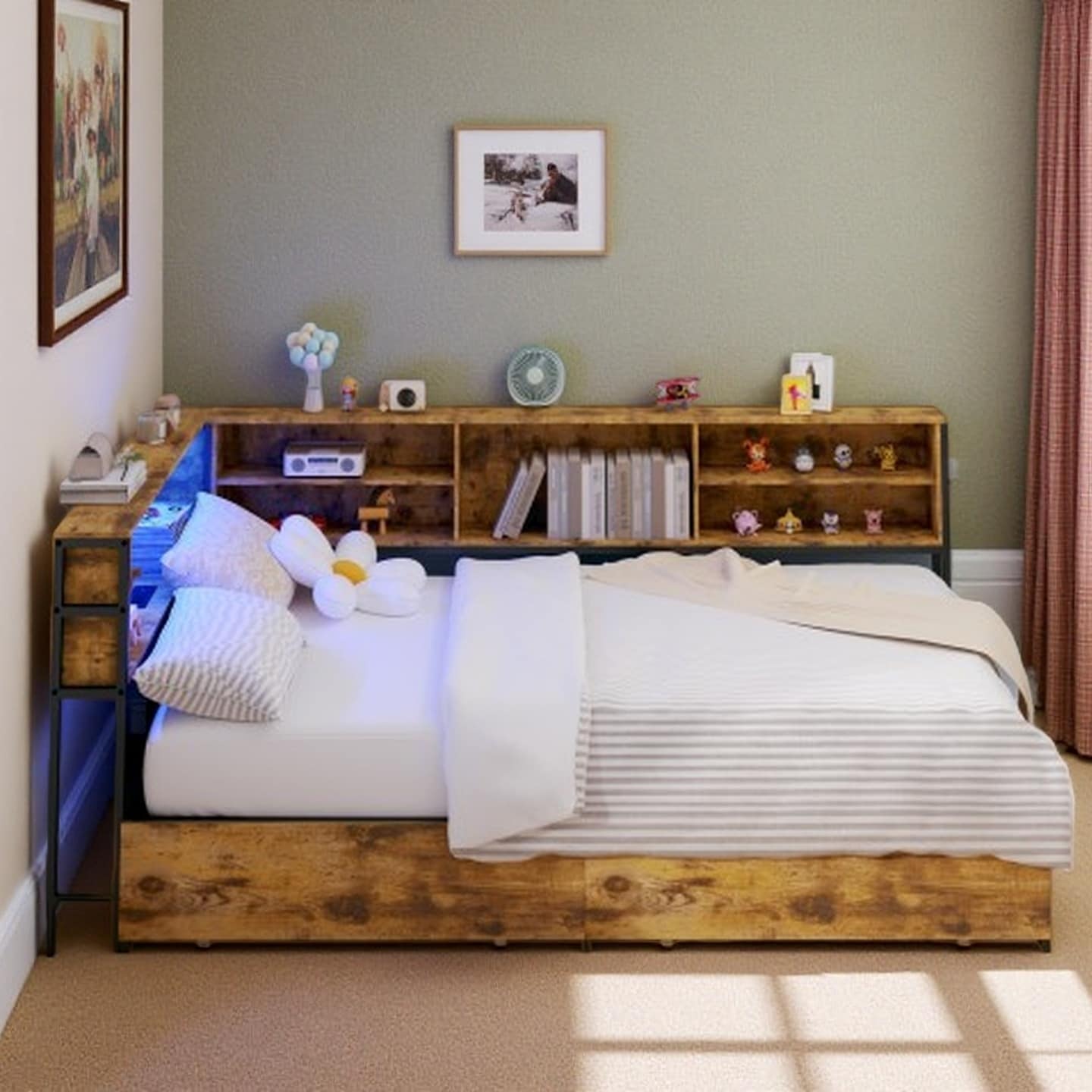 Full Corner Kids Daybed with Storage Drawers, Integrated Bookcase Headboard, LED Lighting and Charging Station
