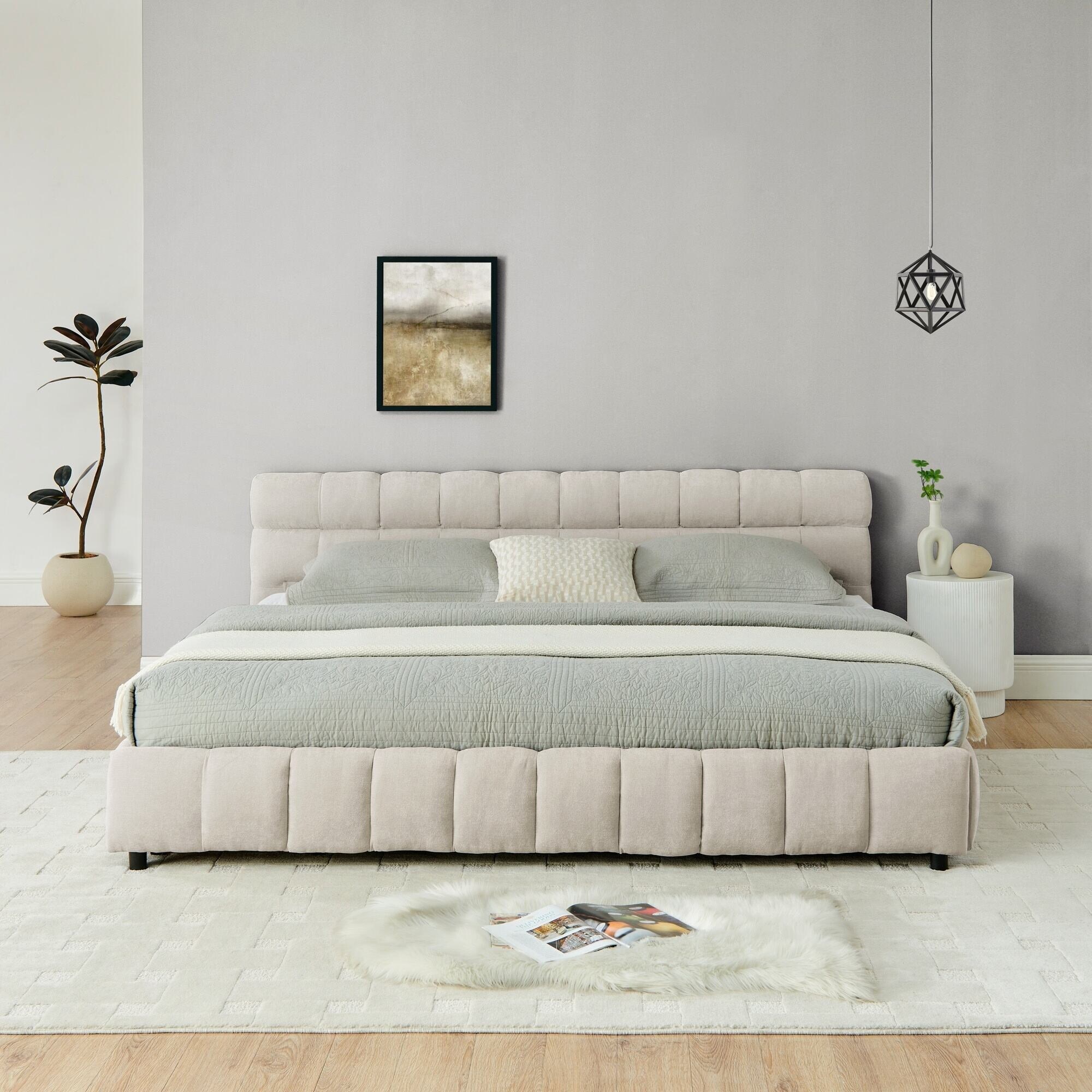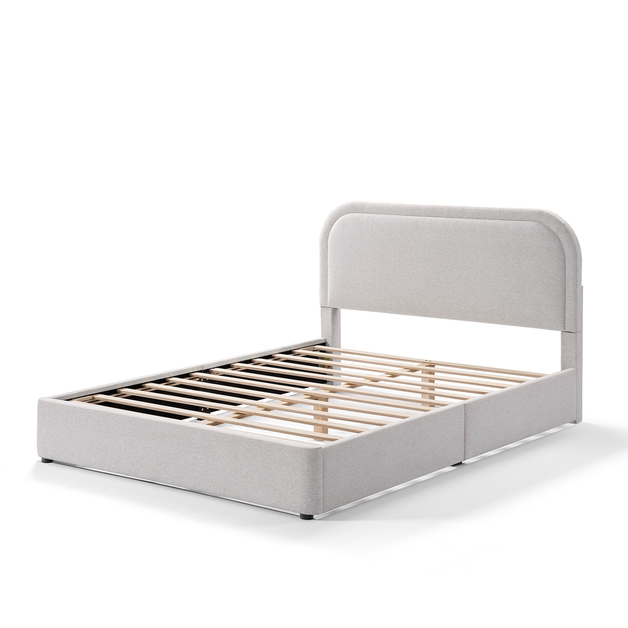 Queen Size Bed Frame Upholstered Platform Bed with Curved Headboard, No Box Spring Needed, Easy Assembly, Noise Free - Ivory