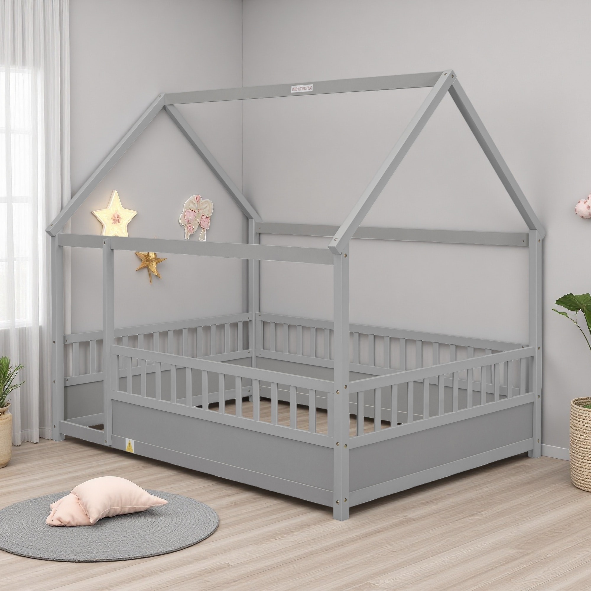 Full Size Pine Wood Montessori Floor Bed Frame - High Safety Fence with Door, Support Slats, Enclosed Play Space