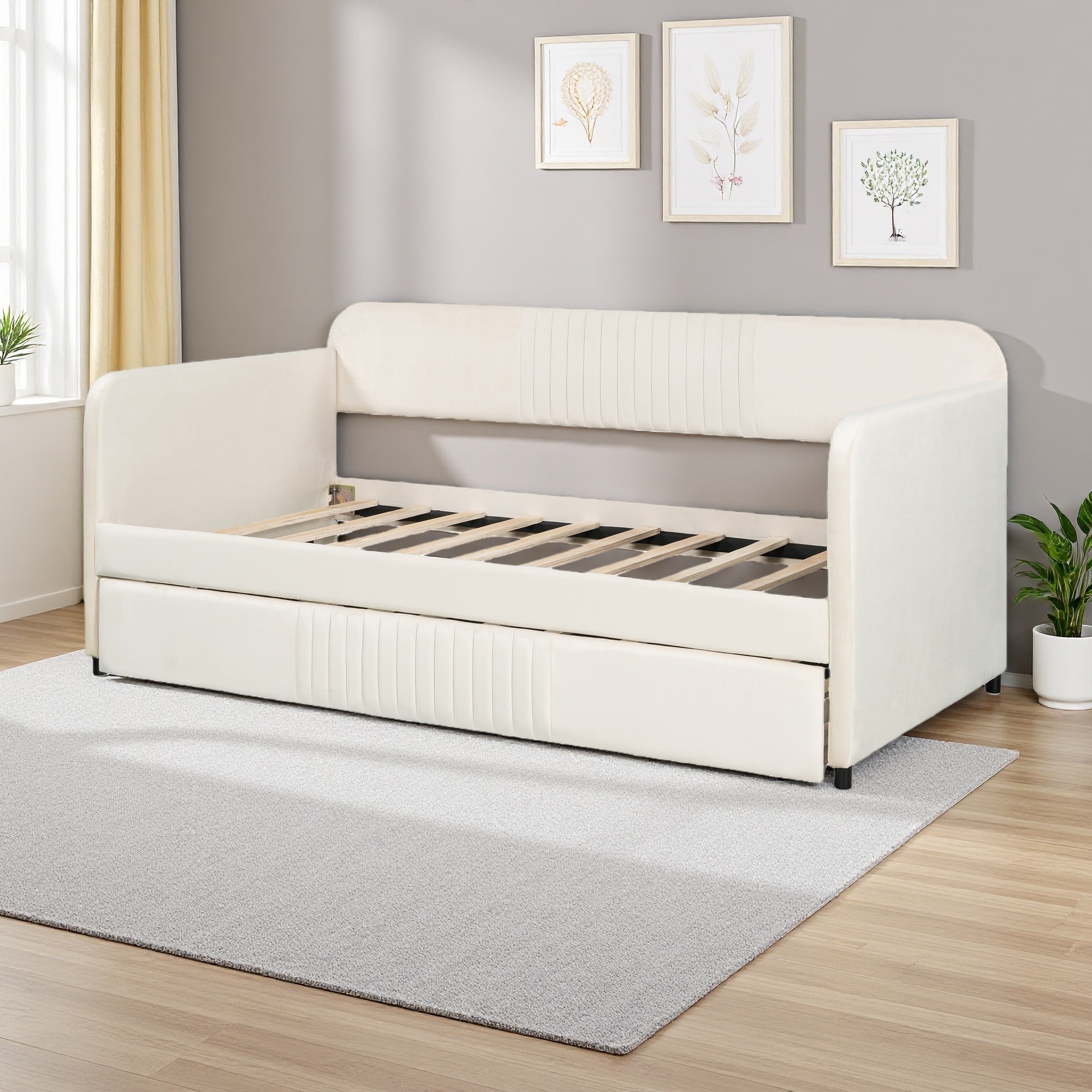 Twin Size Upholstered Velvet Daybed Sofa with Pull-Out Trundle, Wooden Slats, Space-Saving Design with Backrest and Armrests