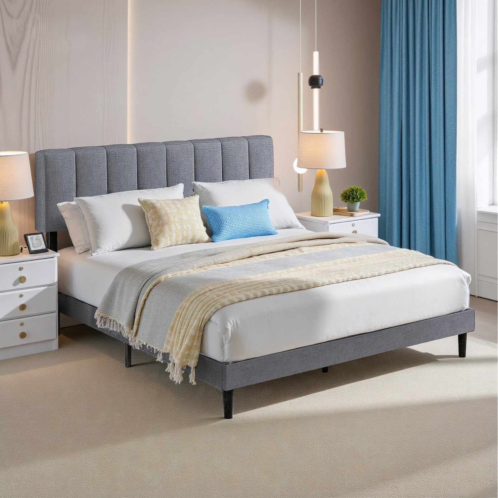 Grey Linen Upholstered Adjustable Height Headboard Platform Bed Wooden Slats Support, No Box Spring Needed