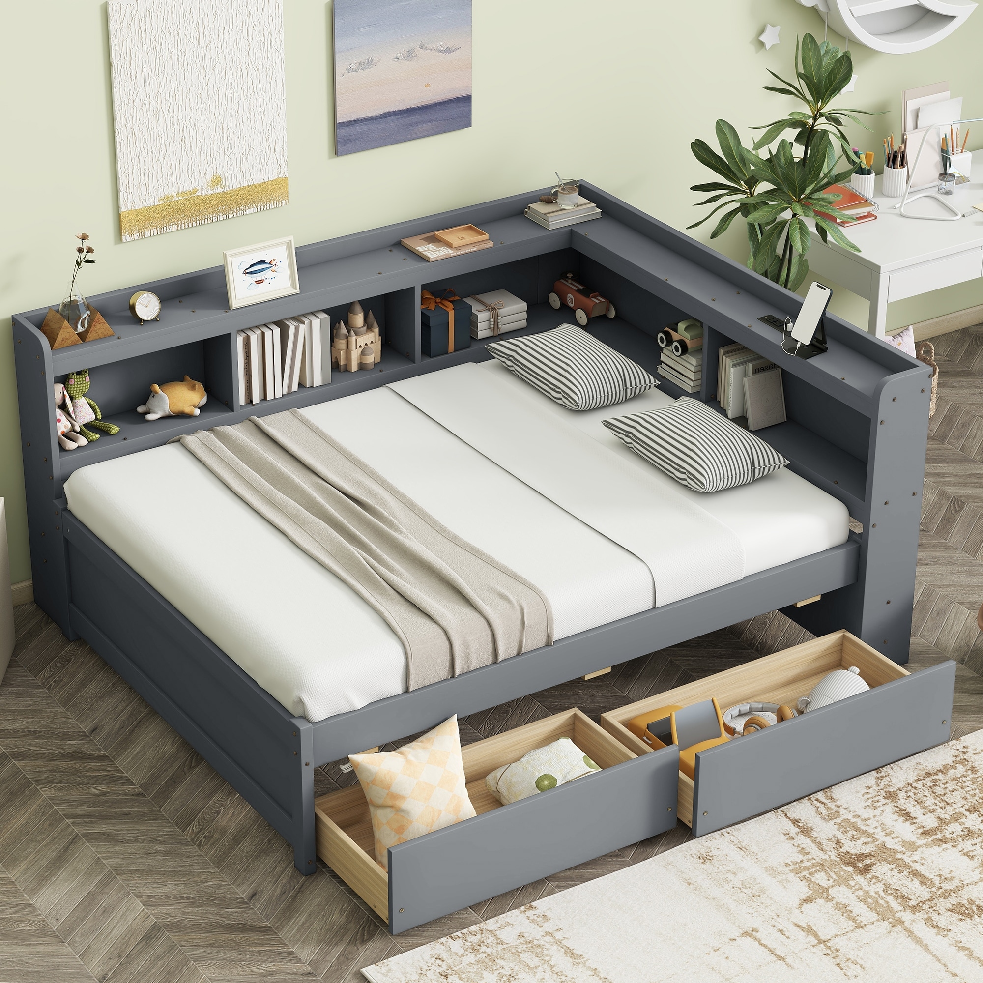 Full Size L-shaped Bookcases Bed with Power Outlets, USB Charging Ports,Two Drawers