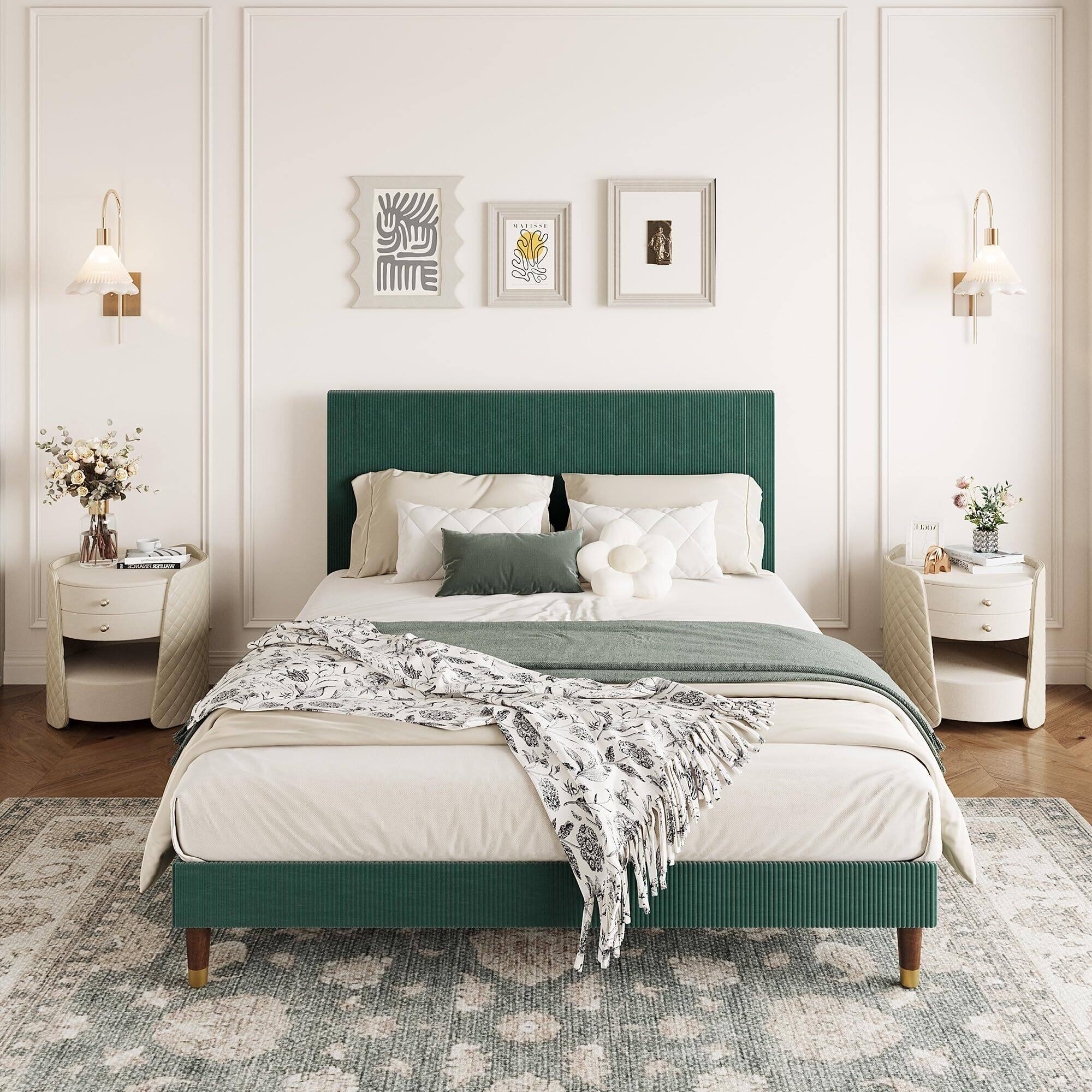 Queen Size Velvet Upholstered Platform Bed with Decorative Curved Headboard