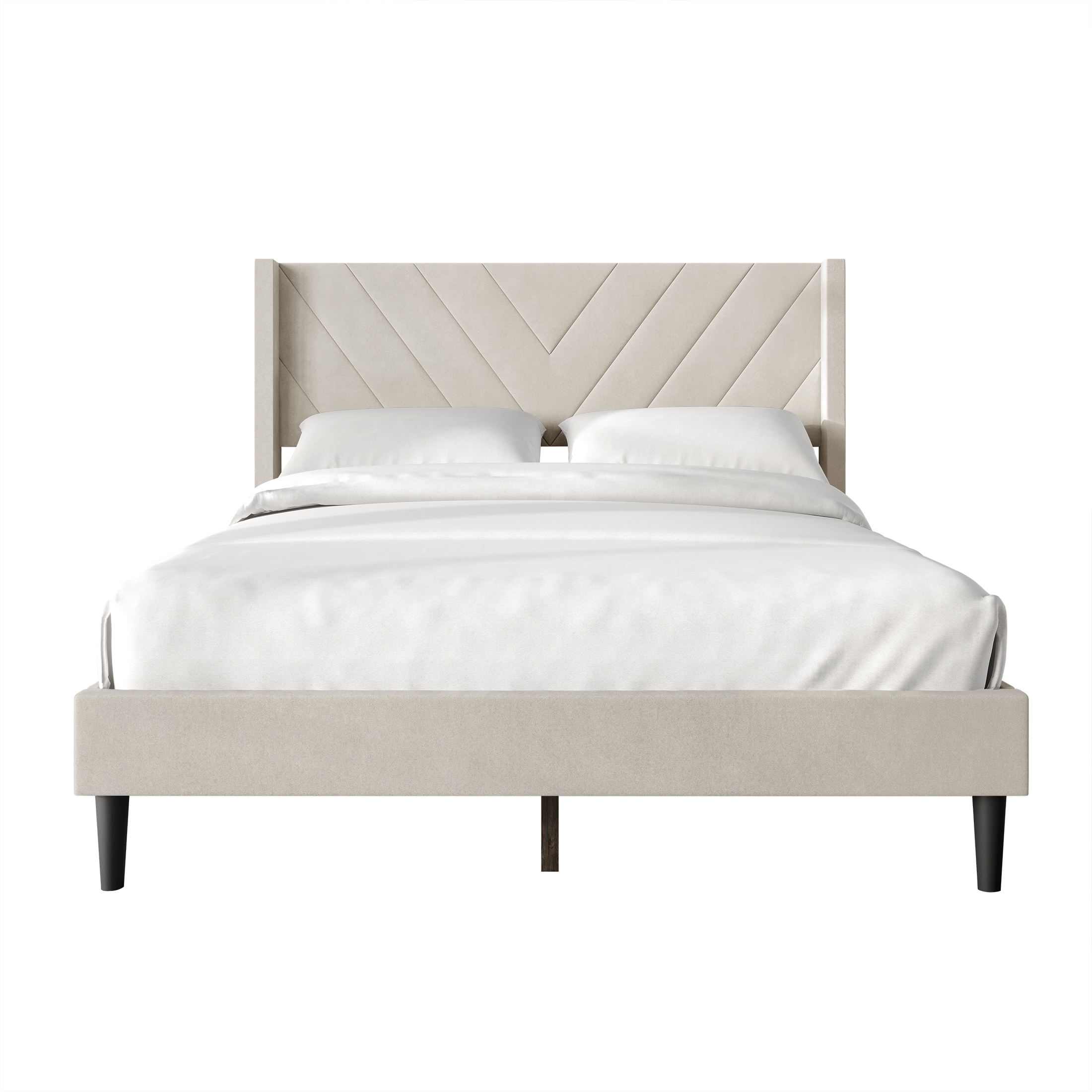 Beige King Size Platform Bed with Wingback Velvet Headboard