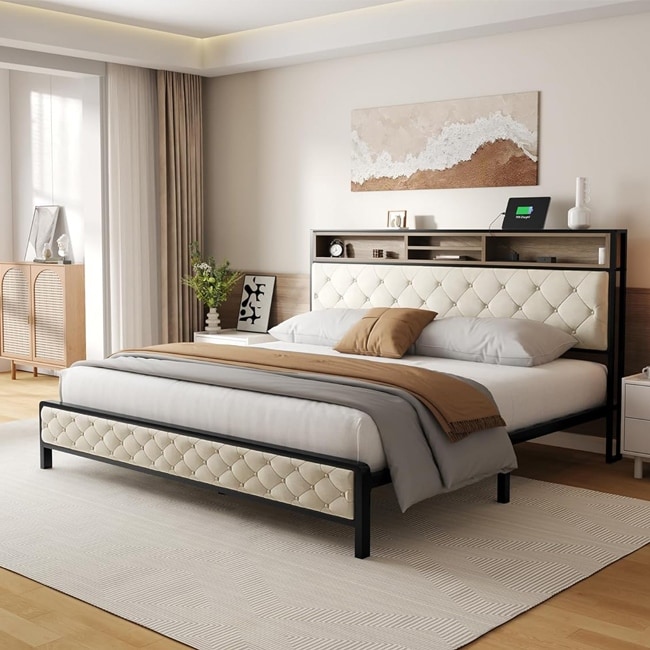 Bed Frame –Platform Style With Charging Station, Upholstered Storage Headboard/Footboard, No Box Spring Needed, Beige.