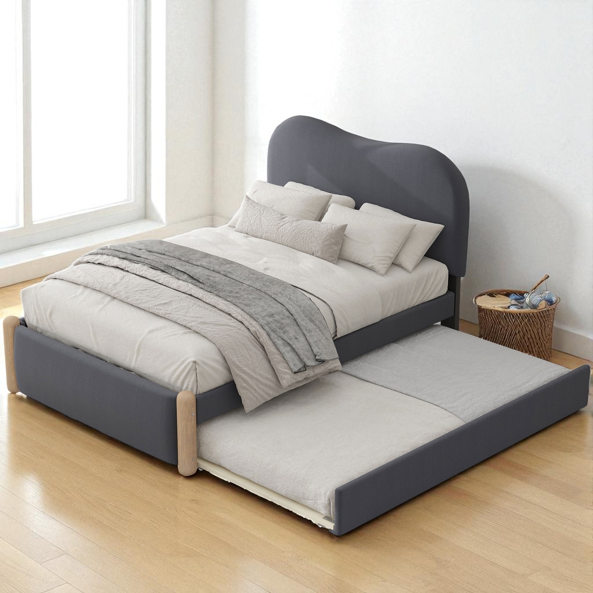 Twin Size Upholstered Platform Bed with Arc Headboard and Pull-Out Trundle, Berber Fleece Fabric and Wooden Legs