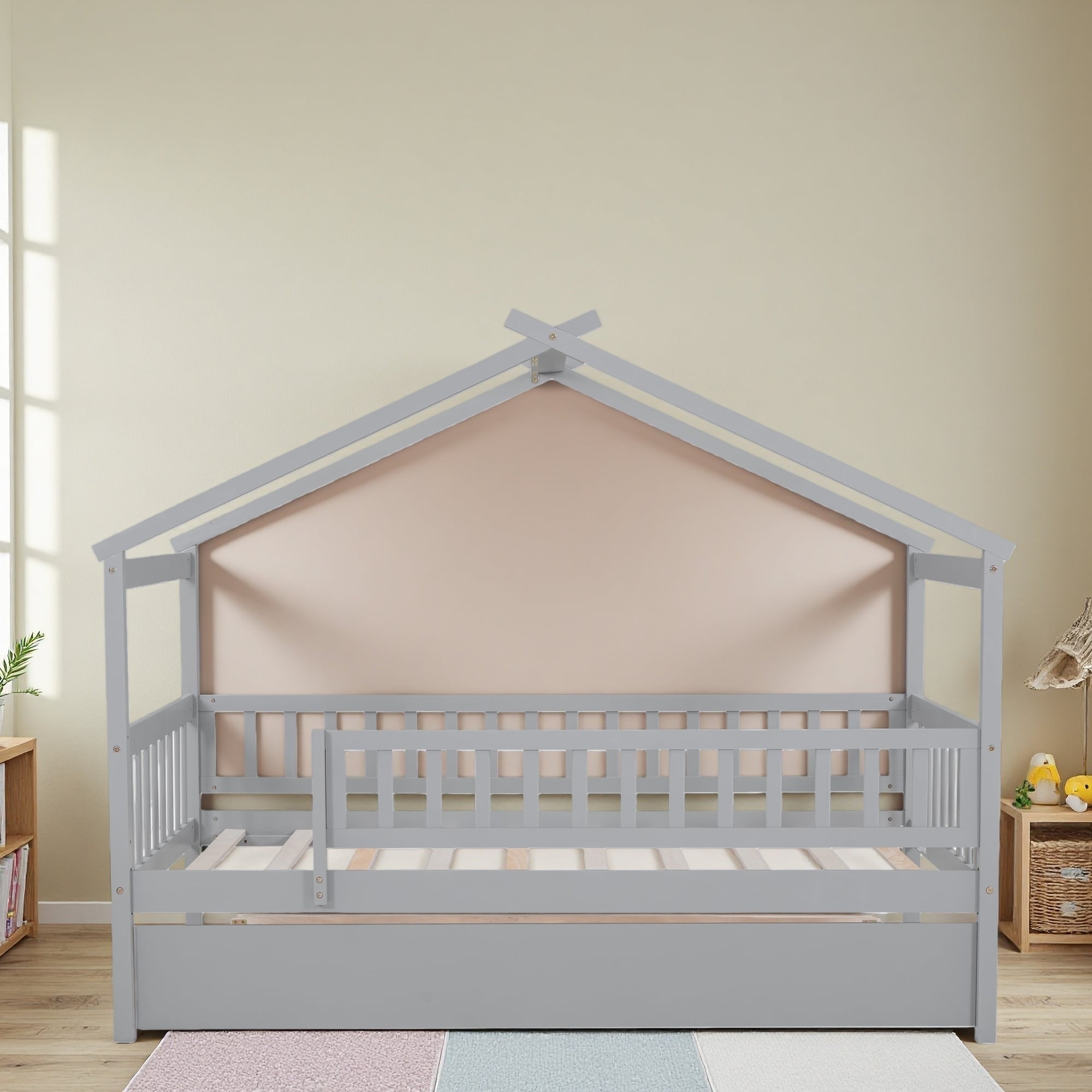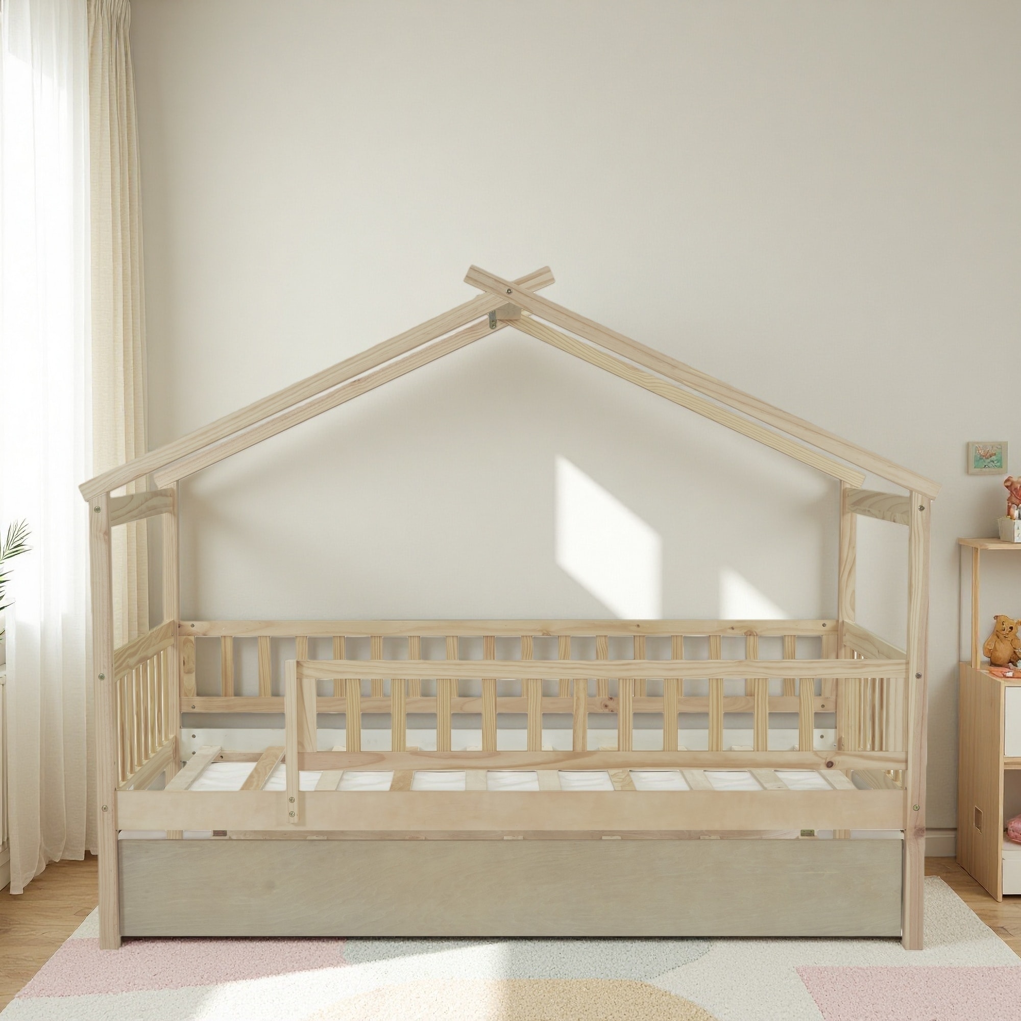 Twin Size Wooden House Bed with Twin Size Trundle, Solid Pine Wood Construction and Space-Saving Design with Extra Storage