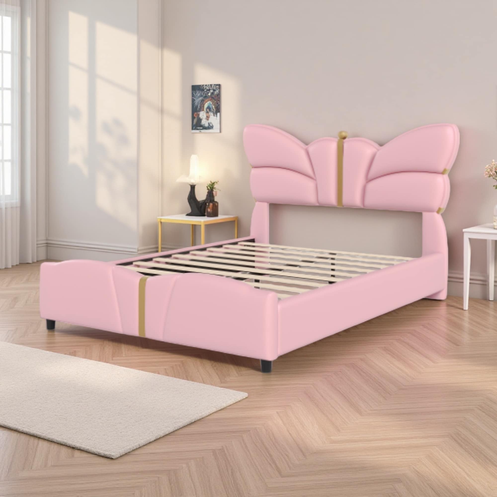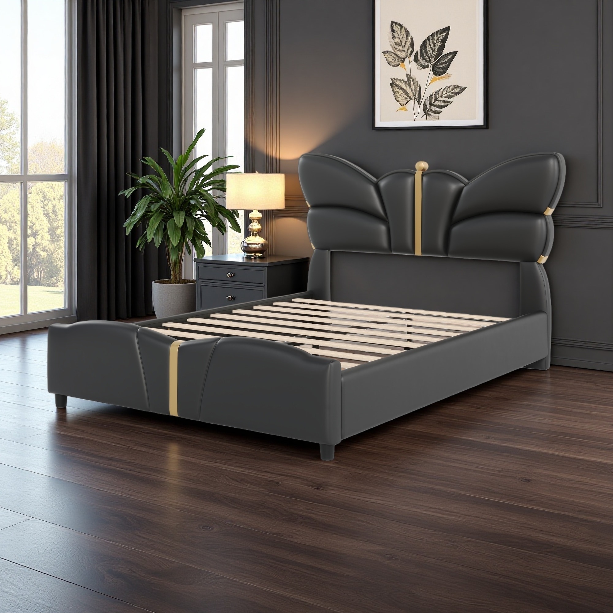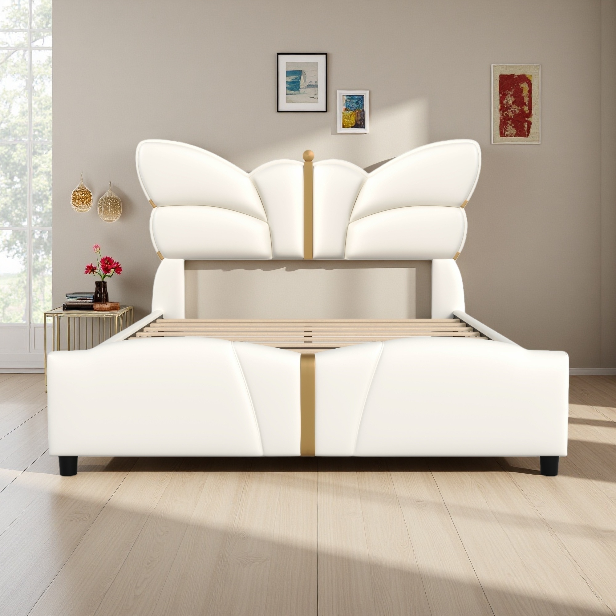 Full Size PU Leather Upholstered Bed with Butterfly Shaped Headboard, Metal Decorations, Sturdy Frame, No Box Spring Needed