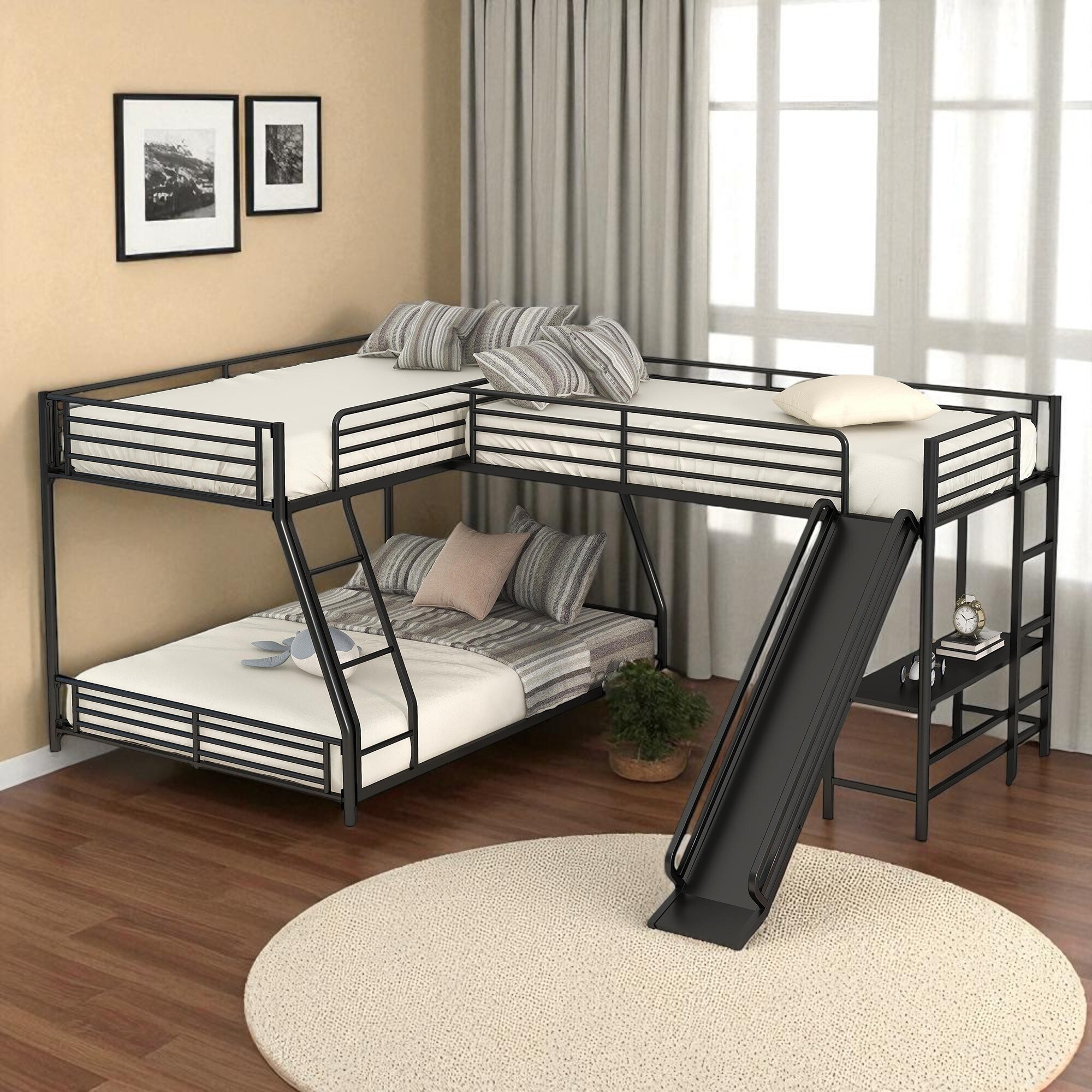 L-Shaped Twin Over Full Bunk Bed with Twin Loft, Built-in Desk and Slide, Metal Frame for 3 Beds