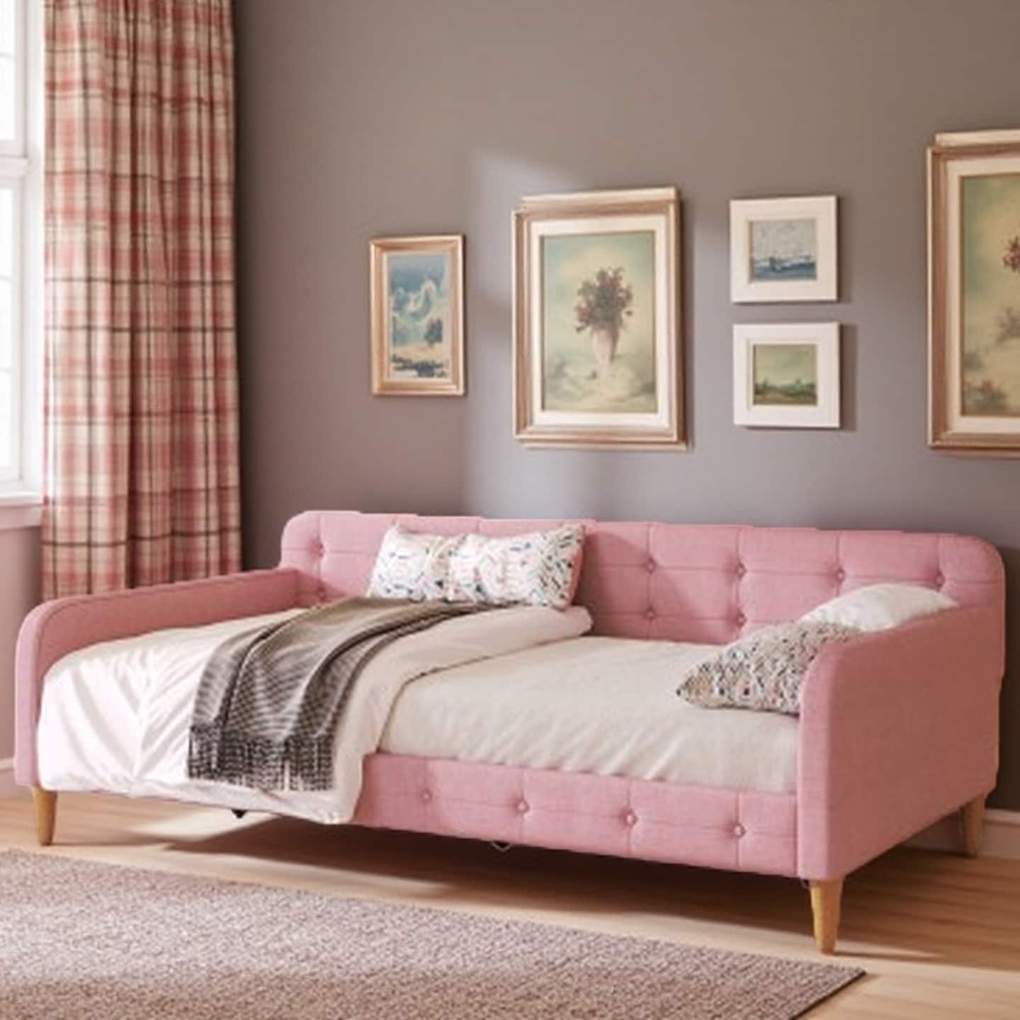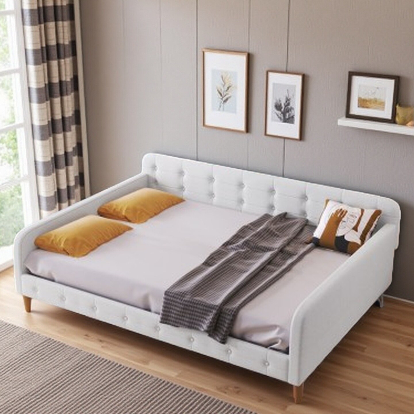 Full Size Linen Upholstered Daybed with Armrests and Sturdy Frame, Modern Sofa Bed with 4 Support Legs
