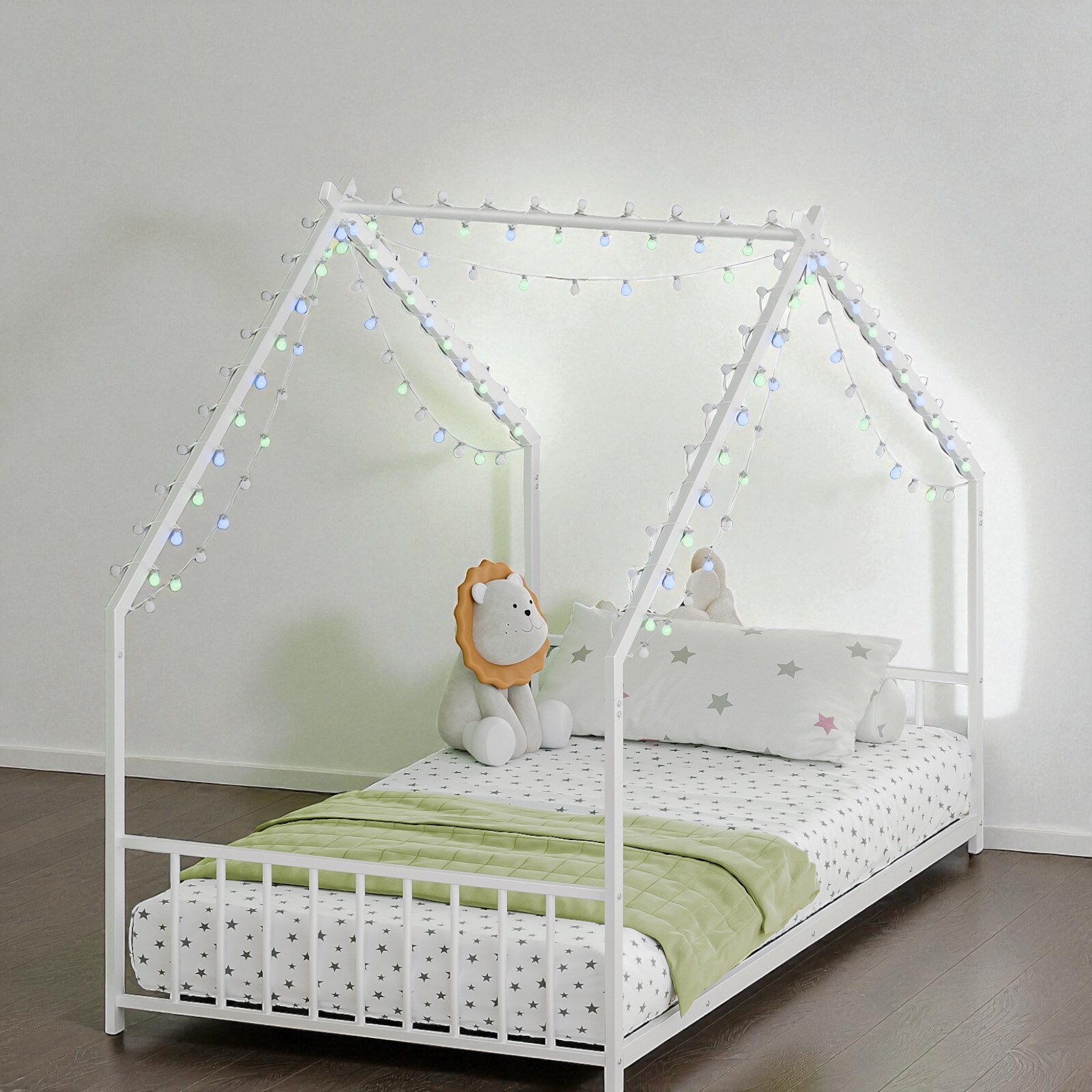 Twin Size Kids Bed Frame with Roof Design and LED Lights, Low Floor Metal Bed with Slats, Iron House Bed for Children