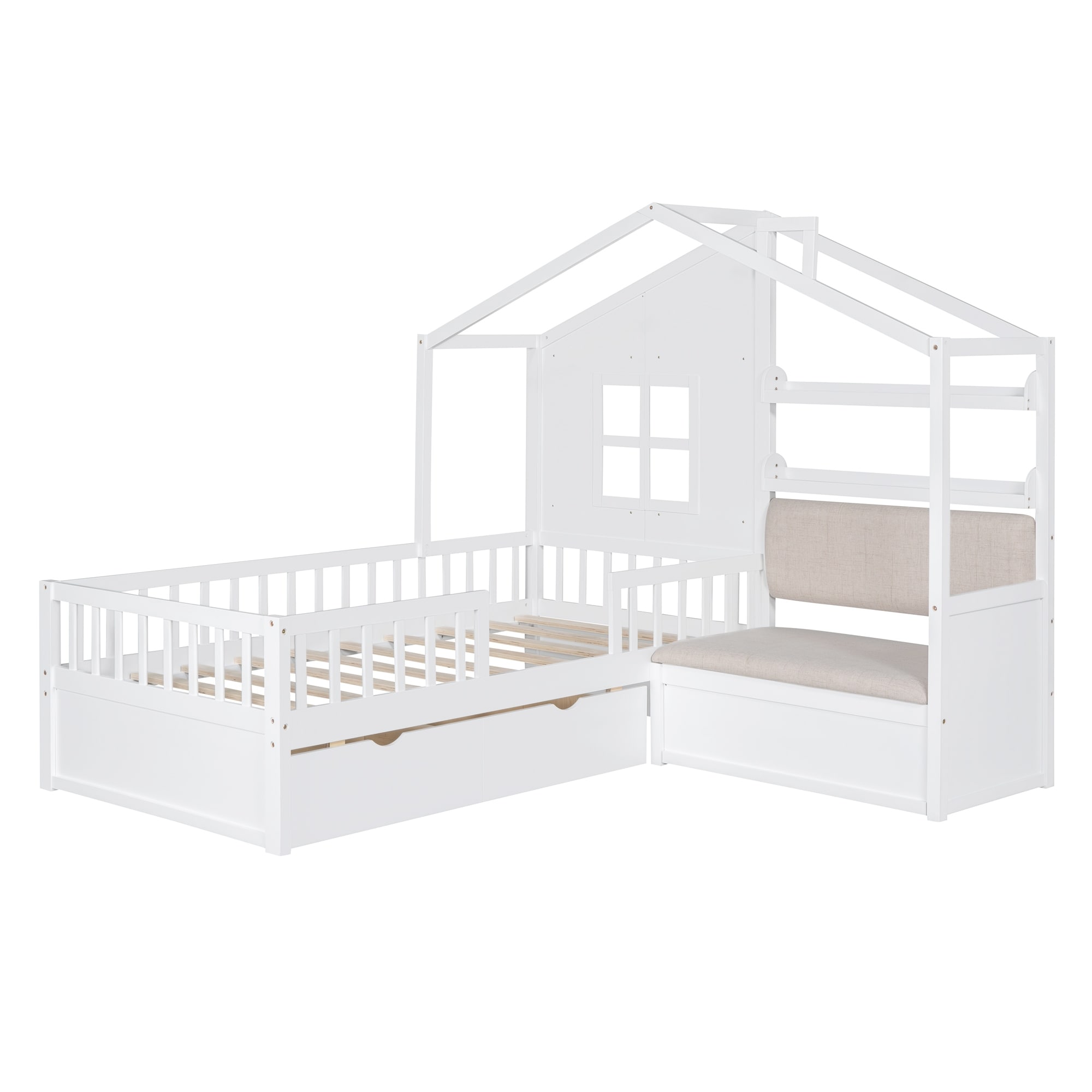 Full Size Wooden Loft Bed w/ Retractable Writing Desk Upholstered Platform Bed & Storage Stairs & Shelves Storage Bed