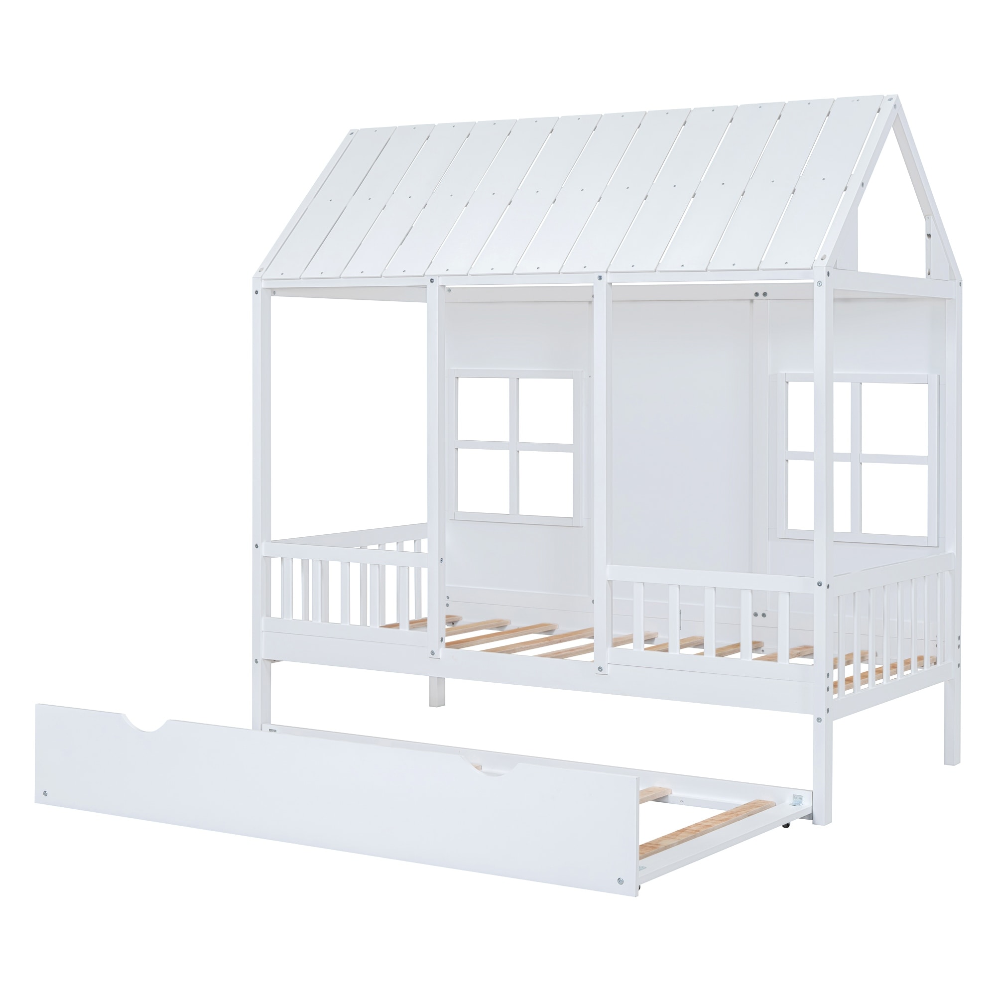 Wooden House Bed Daybed With Twin Trundle, Windows and Roof