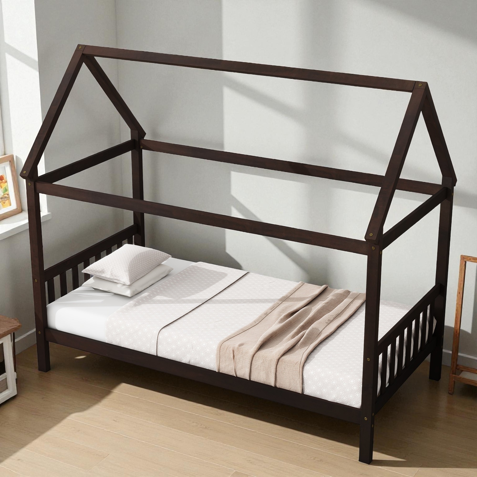 Twin Size House Bed with Headboard and Footboard, Solid Wood Montessori Floor Frame with Underbed Storage Space