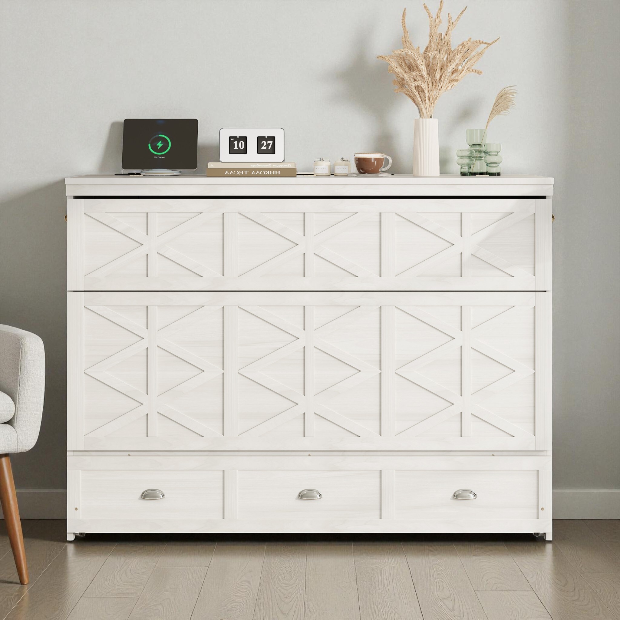 Queen Size Murphy Bed with USB Ports and Large Storage Drawers, Space-Saving Wall Bed Cabinet, Modern Brushed Finish