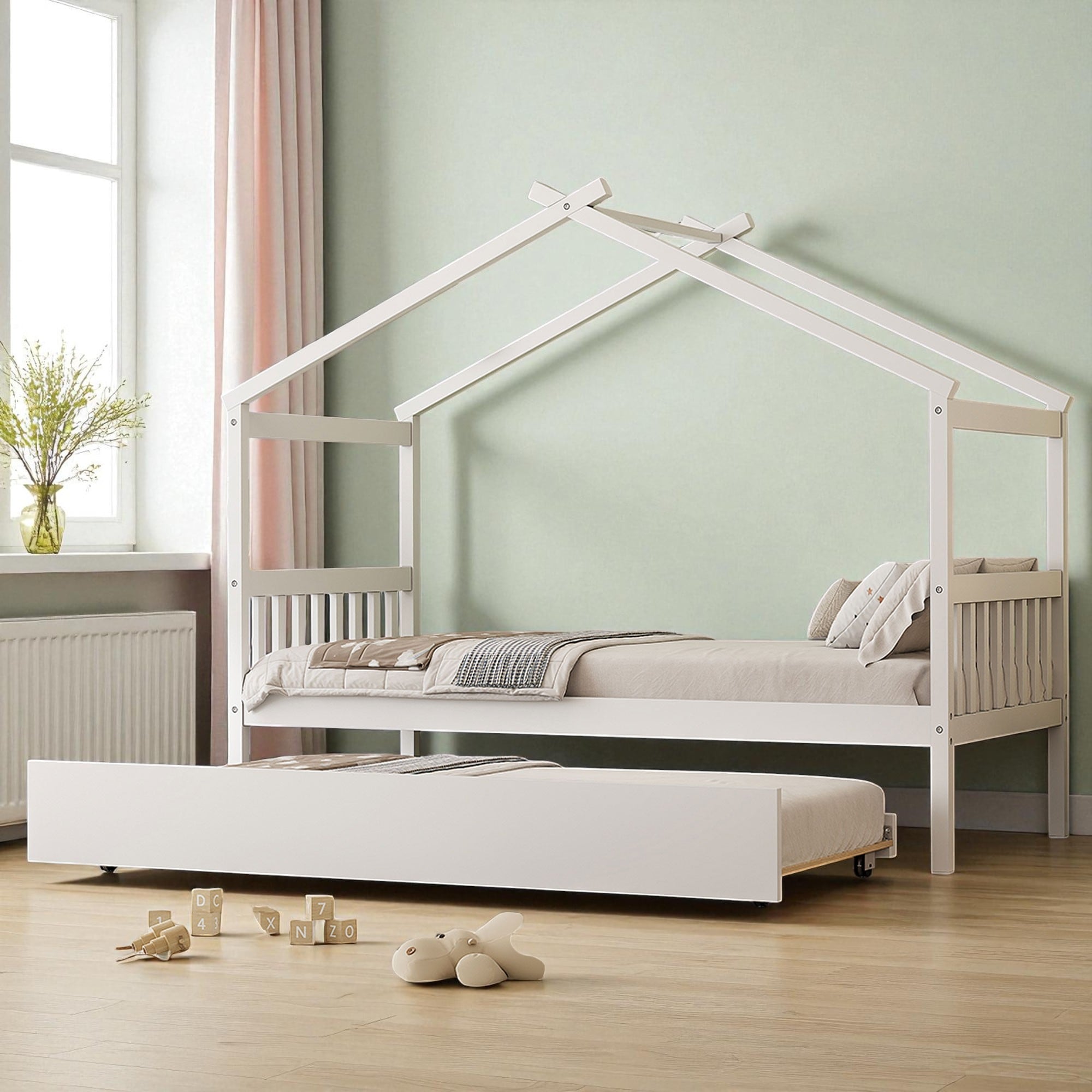 Twin Size Wooden House Bed with Trundle, Roof Frame and Headboards, Slat Support Daybed for Kids or Guest Room