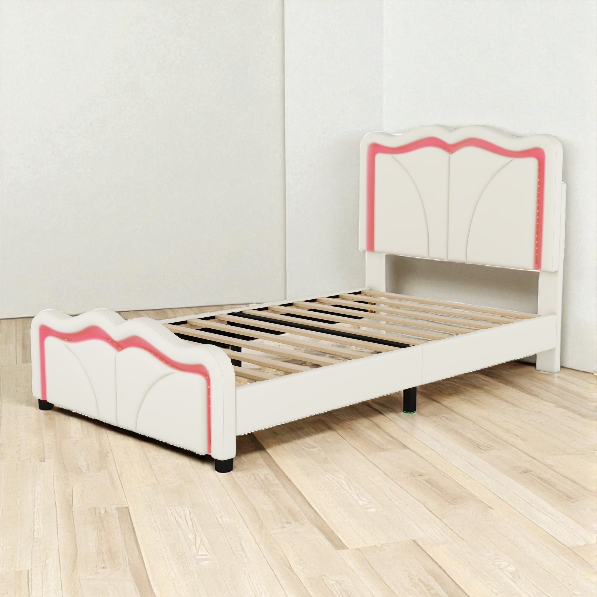 Twin Size Upholstered Platform Bed with Adjustable Curve Headboard and LED Strips, PU Leather Frame