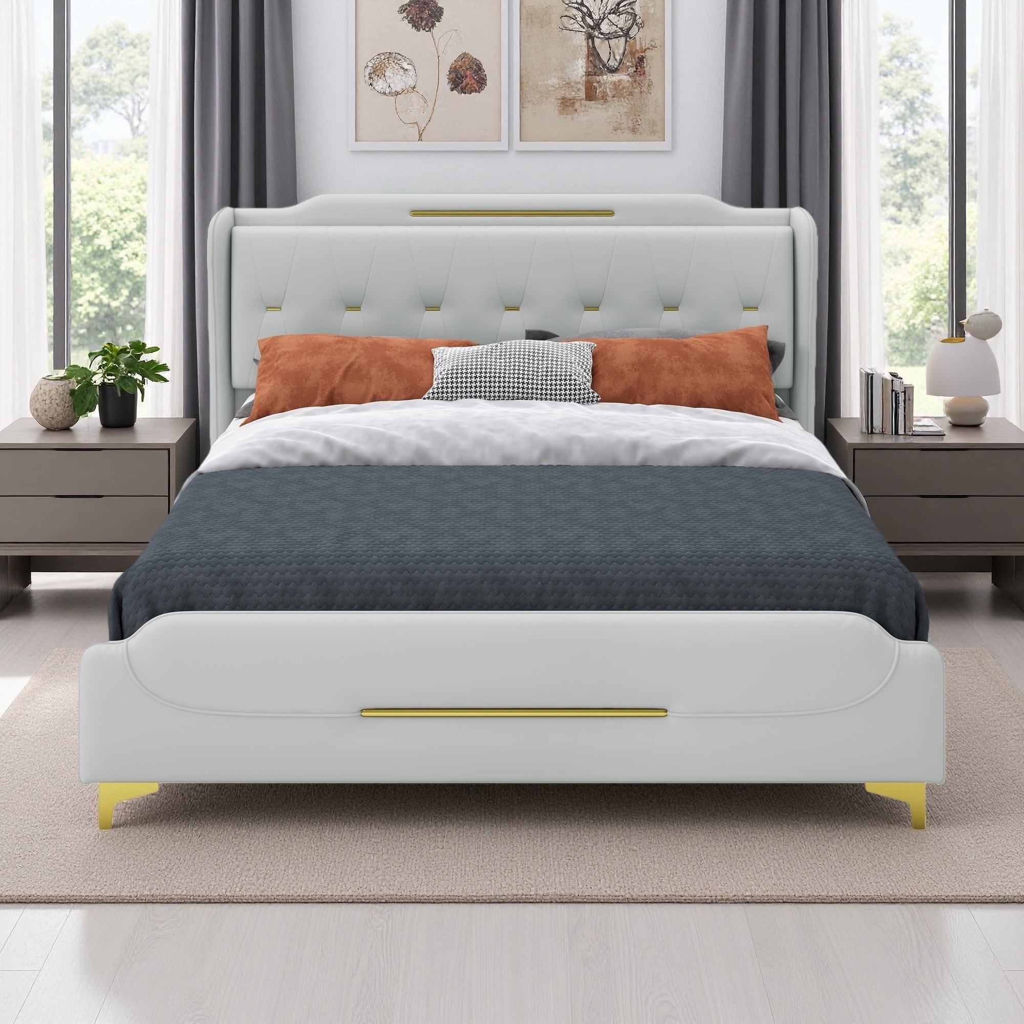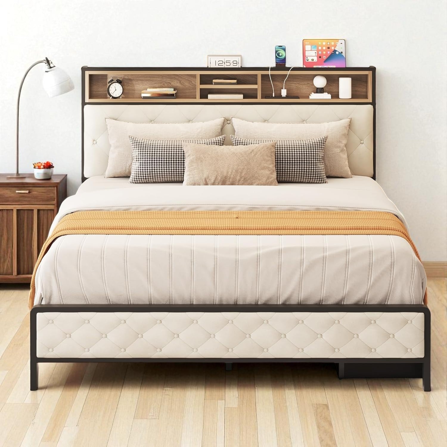 Queen/King Size Platform Bed Frame with Charging Station, Upholstered Storage Headboard & Metal Slats