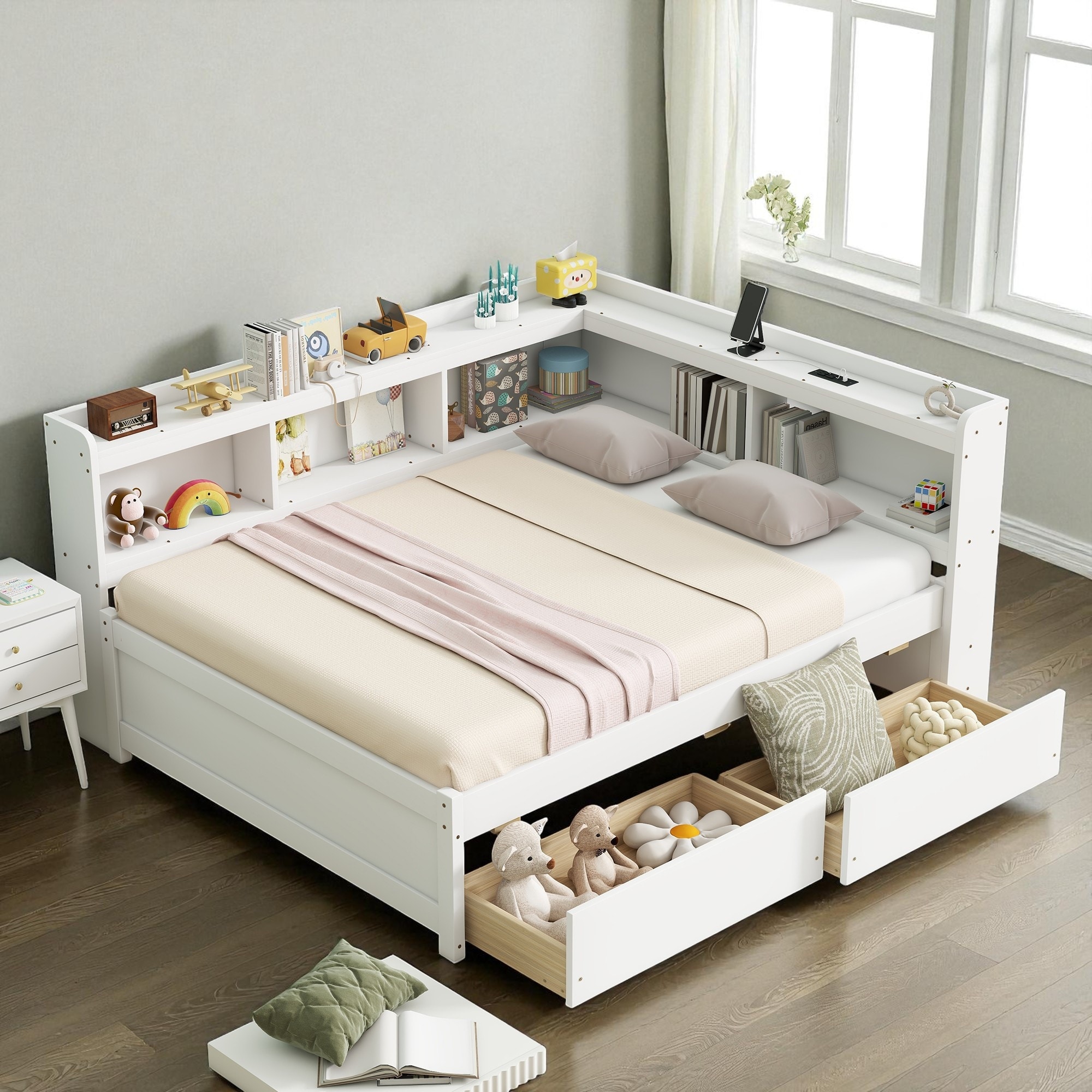 Full Size Bed with L-Shaped Bookcases, Built-in Power Outlets, USB Ports, and 2 Storage Drawers, Slat Support
