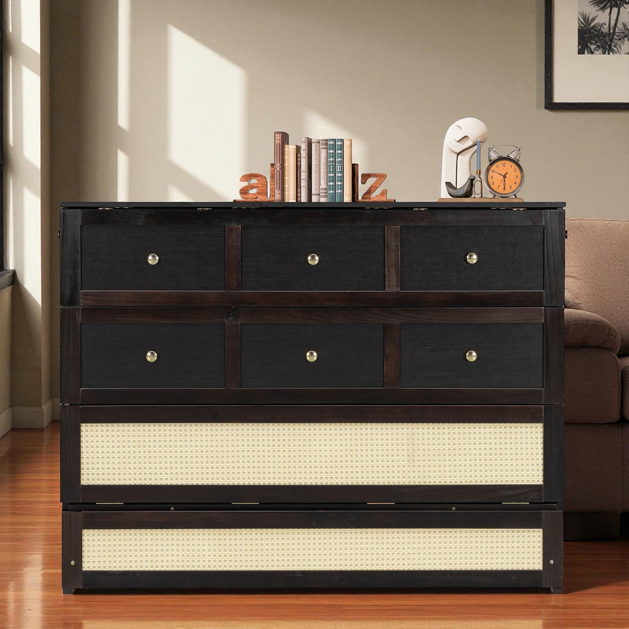 Full Size Murphy Bed with Storage Drawers, Foldable Space-Saving Cabinet Bed, Modern Rattan Design, No Box Spring Needed