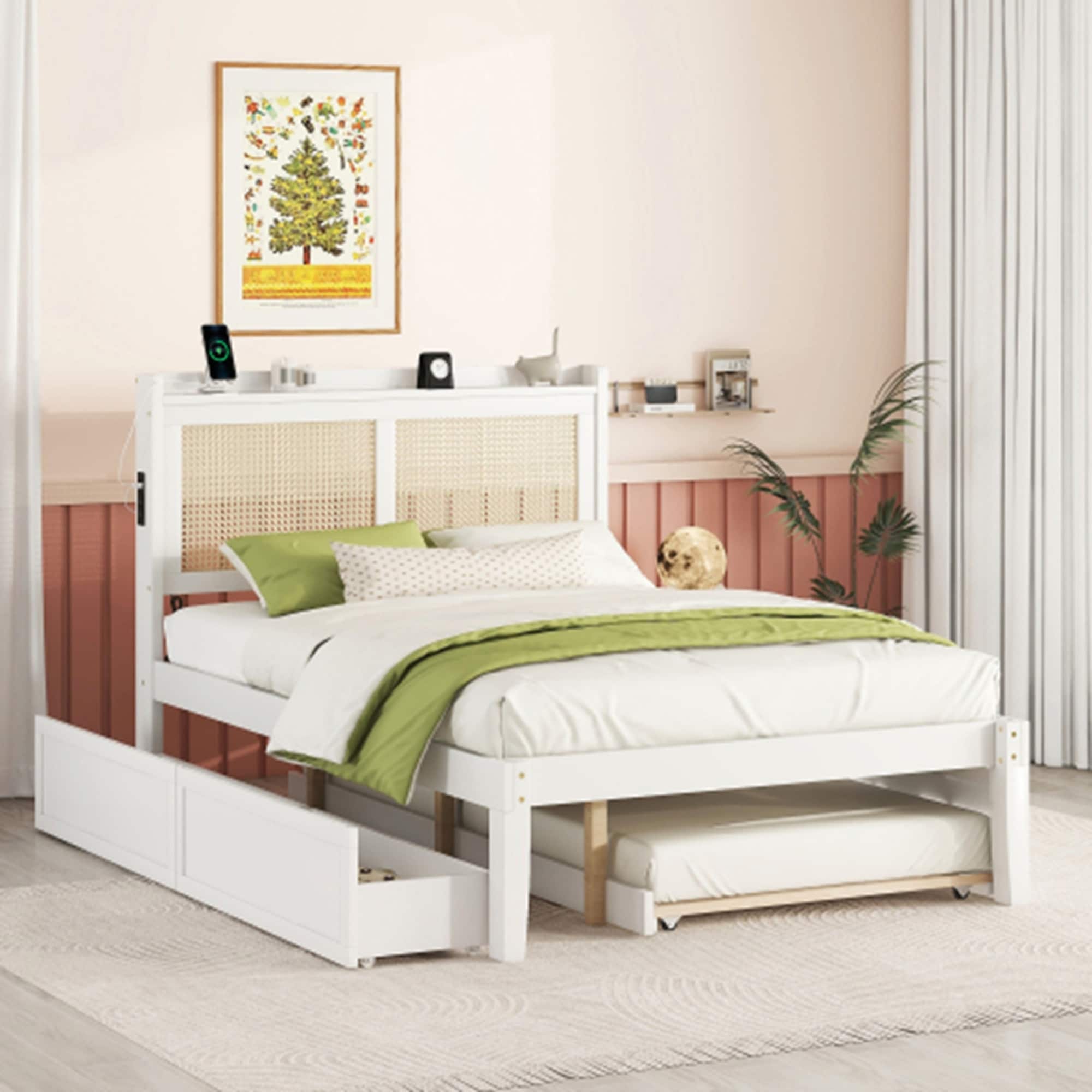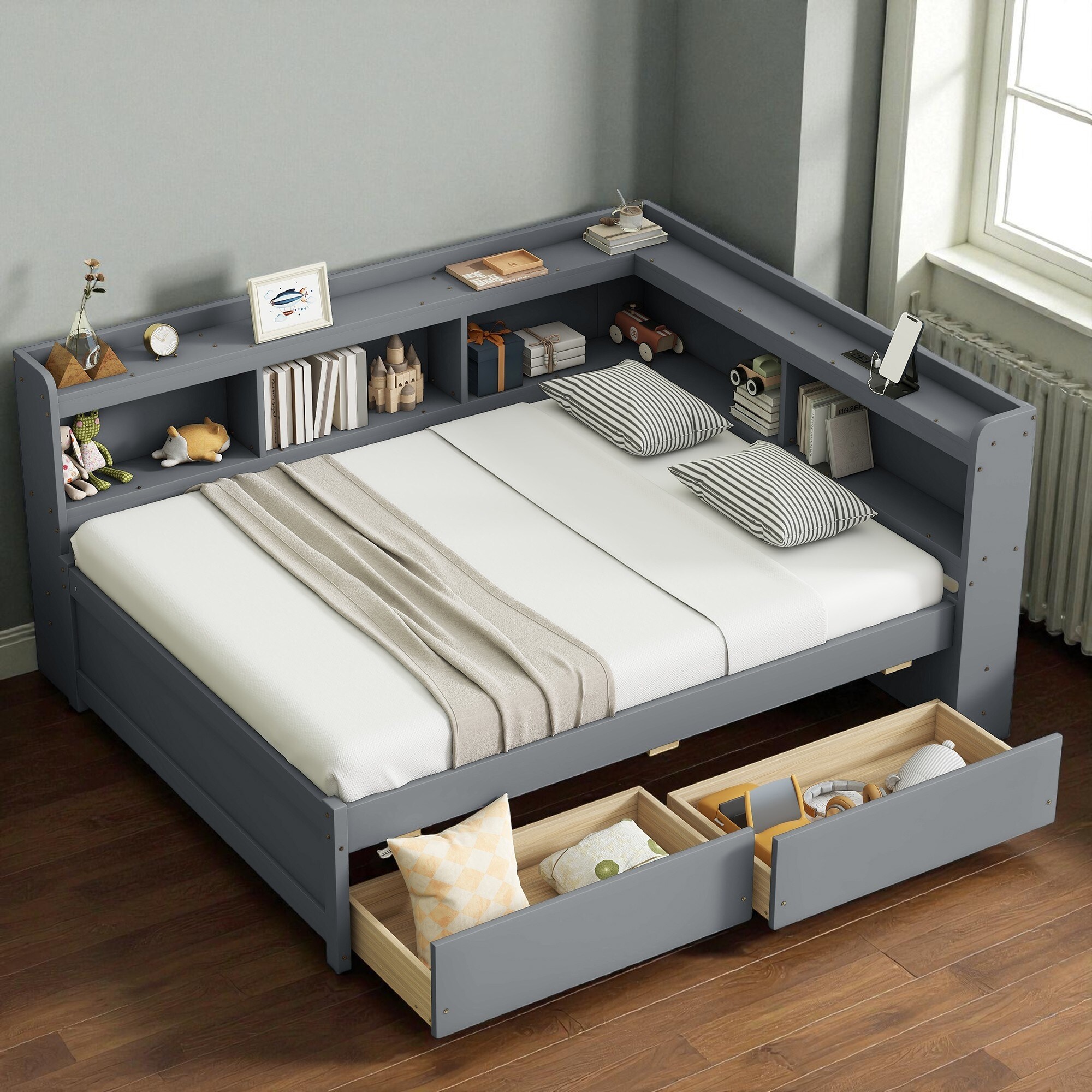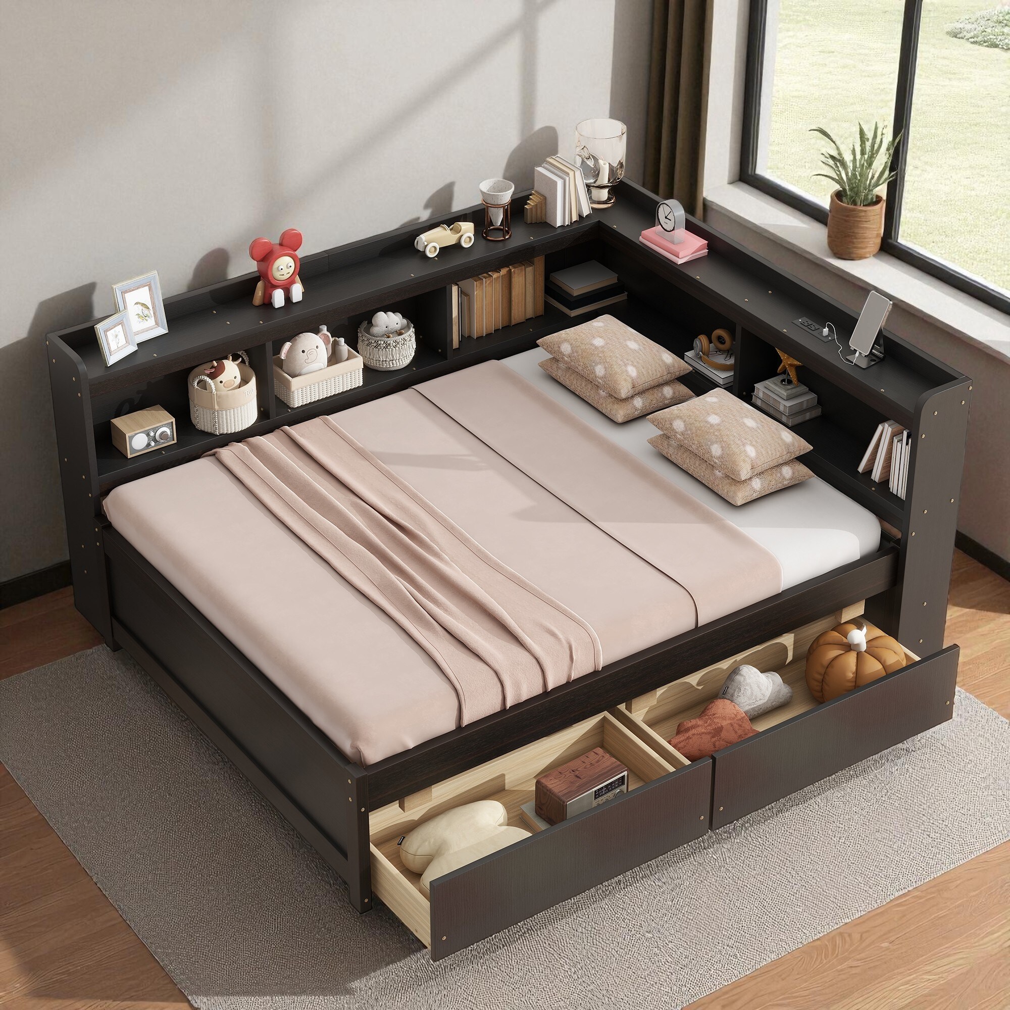 Full Size Bed with L-Shaped Bookcases, Built-in Power Outlets, USB Ports, and 2 Storage Drawers, Slat Support
