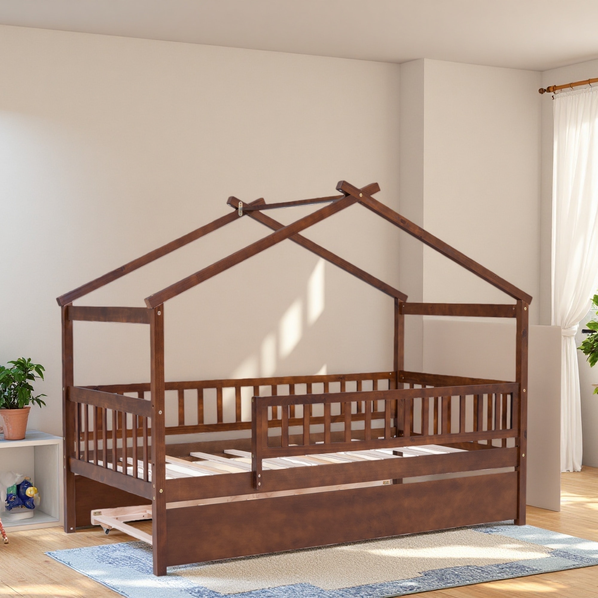 Twin Size Wooden House Bed with Twin Size Trundle, Solid Pine Wood Construction and Space-Saving Design with Extra Storage