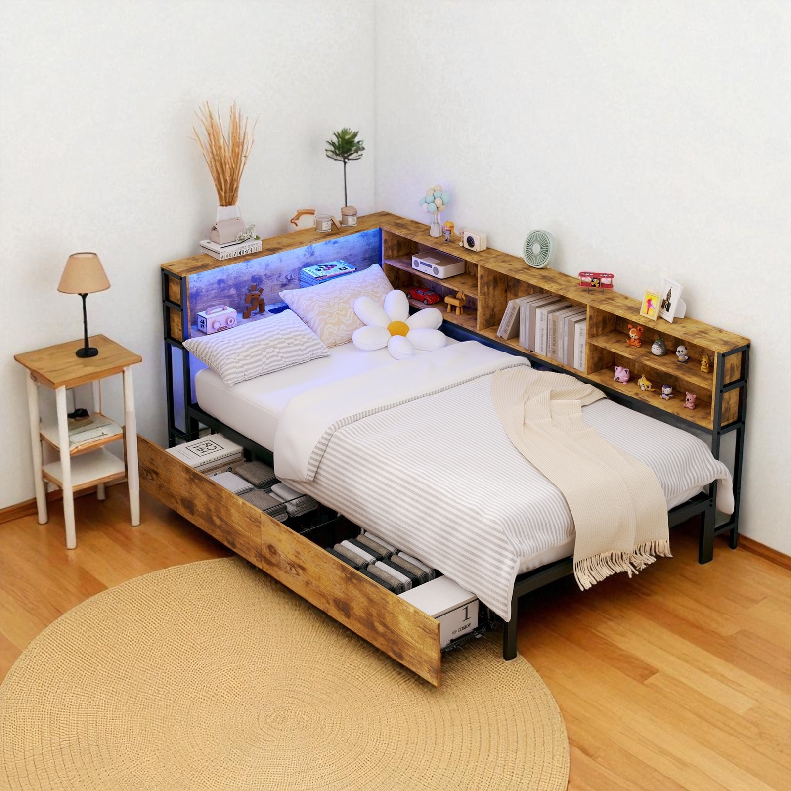 Corner Twin Bed Frame with Storage Drawers, Bookcase Headboard, Charging Station and LED Lights for Kids or Teens