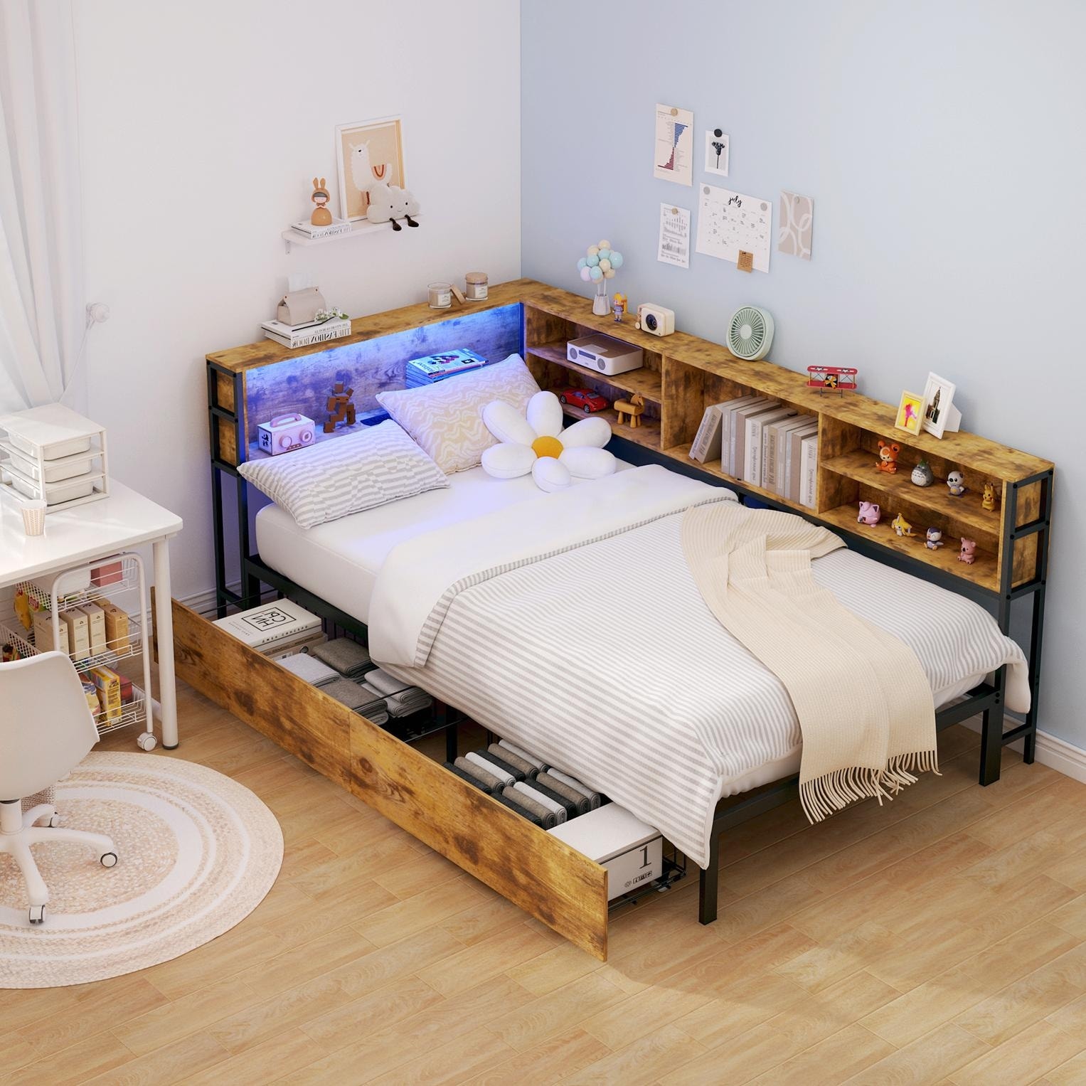Corner Bed Frame with Storage Bookcase & LED Lights - Full/Twin