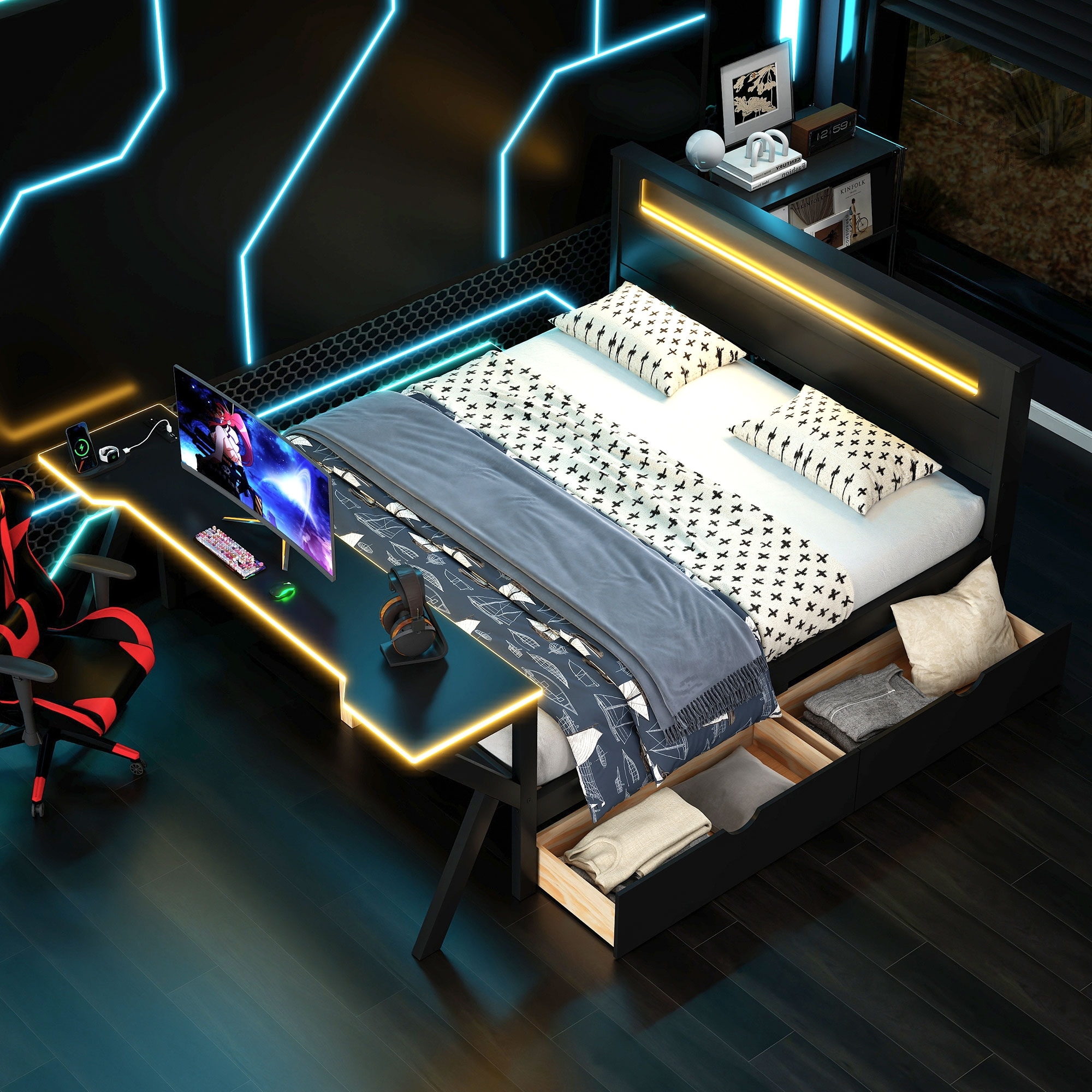 Wooden Gaming Platform Bed with LED Headboard, LED Desk, USB and 2 Storage Drawers, Black Bed Frame
